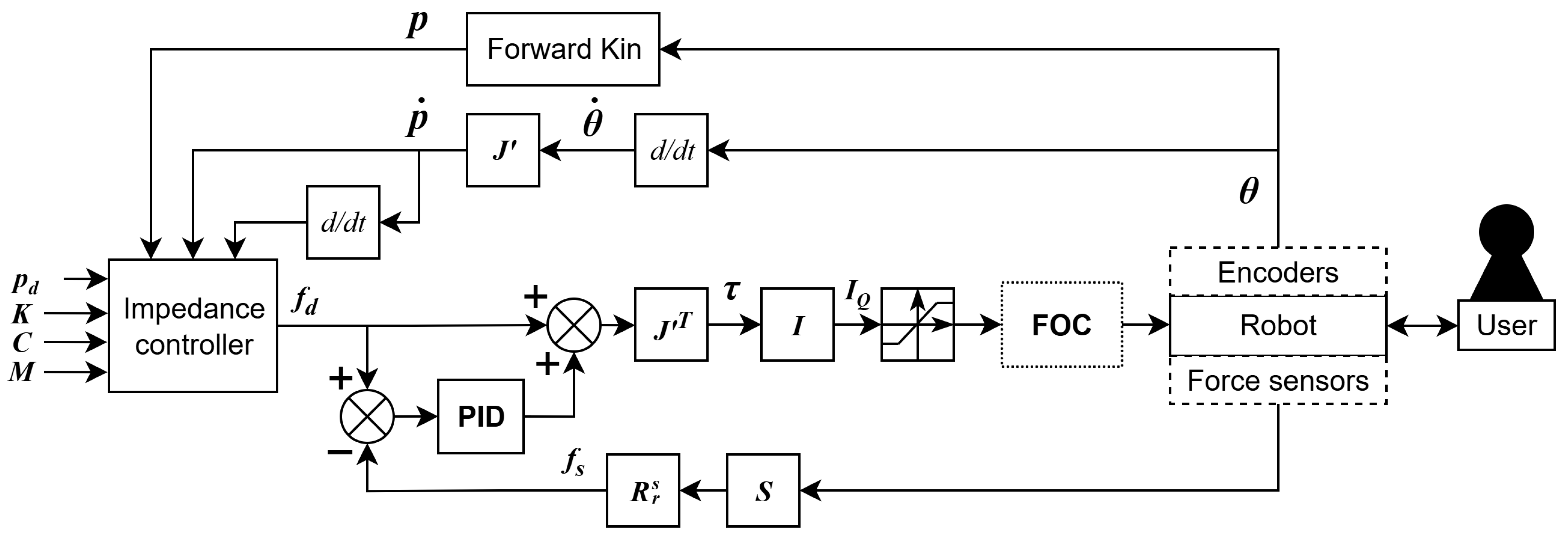 - Hogan, N. Impedance Control: An Approach to Manipulation: Part I—Theory. In Proceedings of the 1984 American Control Conference, San Diego, CA, USA, 6–8 June 1984. [Google Scholar]