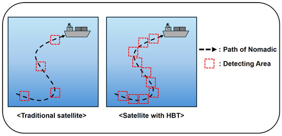 The concept of SR: Comparison between traditional satellite communication’s intermittent coverage (low SR) and HBT’s continuous tracking (high SR).