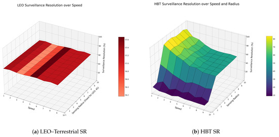 According to Figure 5, as the speed increased, the SR showed constant changes in both structures, but the trend was distinctly different for each structure. The HBT structure maintained a high SR of up to 88% or more in the sections from Speed 1 to 3, but the performance gradually decreased as the speed increased to 5 or more. In particular, at Speed 9, it fell to the 50% level, making it difficult to track fast-moving nomadic infrastructure in real time. This is due to the monitoring delay caused by the widening gap between the sensing period of the LAP and the actual location change. On the other hand, in the LEO structure, the SR remained stable in the range of about 56–58% over the entire speed section. It shows structural characteristics that are less sensitive to movement speed changes due to the characteristics of an LEO system with a wide monitoring radius and a fixed update period. In summary, HBT shows precise and excellent performance in a low-speed environment, but its performance decreases to a level similar to that of LEO in a high-speed environment, while LEO operates as a conservative monitoring structure that is resistant to speed changes while having low precision. As a result of measuring the SR performance by changing the sensing radius from 1 to 10, the overall probability resolution of the HBT structure improved significantly as the radius increased. At the level of 1 to 3, an overall low SR was shown due to the lack of coverage, and if the radius was 6 or more, more than 70% stable tracking was possible under most speed conditions. In particular, when the speed is less than the middle of 1 to 5, the radius expansion effect is maximized, and the surveillance performance is improved dramatically. This shows the strength that the HBT structure can flexibly adjust the system performance through the parameter of the sensing radius.