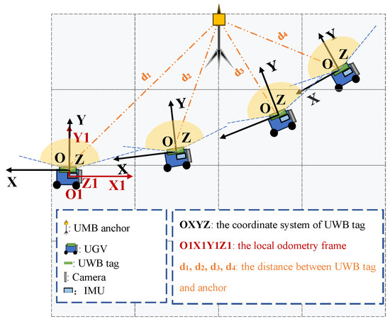 The position of UGV in the local odometry frame is represented as , the position of UGV in the UWB tag coordinate system is represented as . The transformations between the two coordinate systems mentioned above are as follows: