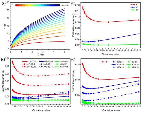 Figure 2a shows that the trajectories with different curvatures, Figure 2b–d are based on Figure 2a. Figure 2b illustrates the significant differences in estimation accuracy among the three algorithms (m1, m2, m3) under the same conditions, where m3 consistently yields the lowest error, m2 performs moderately, and m1 exhibits substantially larger errors in the low curvature region compared with the proposed two algorithms. This indicates that, for low-curvature trajectories, the proposed algorithms achieve more accurate anchor position estimation. Furthermore, Figure 2c,d investigate the effects of range error and azimuth error on the anchor estimation accuracy of the three algorithms. Figure 2c shows that the estimation accuracy of m2 and m3 is less affected than m1 according to range error changing, and Figure 2d shows that the estimation accuracy of m3 is also less affected even with azimuth error changing in the low curvature range (X < 0.04 m), which demonstrates that the proposed algorithm m3 is almost insensitive to changes in range error and azimuth error, and shows better robustness for estimation of anchor position in straight and small-curvature trajectories.