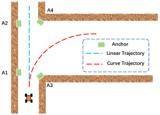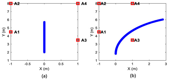 Simulated trajectories and UWB anchor deployment. (a) Straight trajectory, (b) curve motion trajectory.