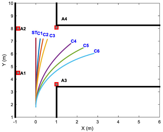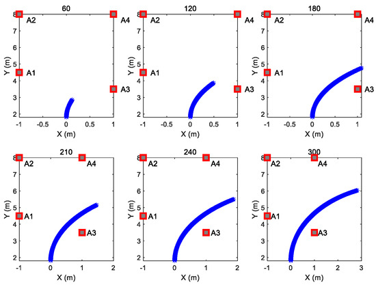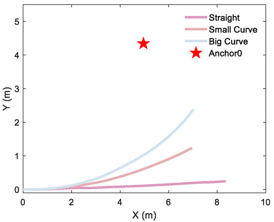 As evidenced in Table 3, it can be found that the four anchors’ position estimation accuracy of the three methods is very close, which indicates that the three methods have no significant difference when the UGV executes the big-curvature trajectory prescribed in Figure 4b. Inspired by the results shown in Table 3, distinct UGV motion curvature trajectories are designed to further evaluate the difference in the three methods on anchor position estimation accuracy.