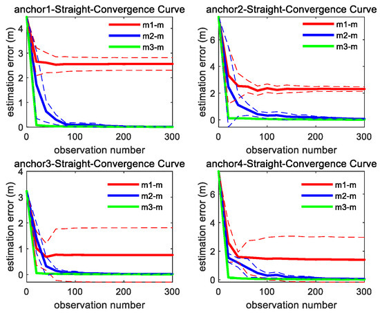 As shown in Figure 7, the convergence speed order of the three methods is the same as straight trajectory. It can be found from Figure 6 and Figure 7 that through integrating the azimuth angle to m1, m2 imposes a constraint between the X and Y coordinate, which makes the estimation convergence speed of m2 better than m1, while m3 further integrates the elevation angle to m2, which maximally restricts the solution space for unknown anchor locations and makes m3 achieve the best optimal convergence speed.