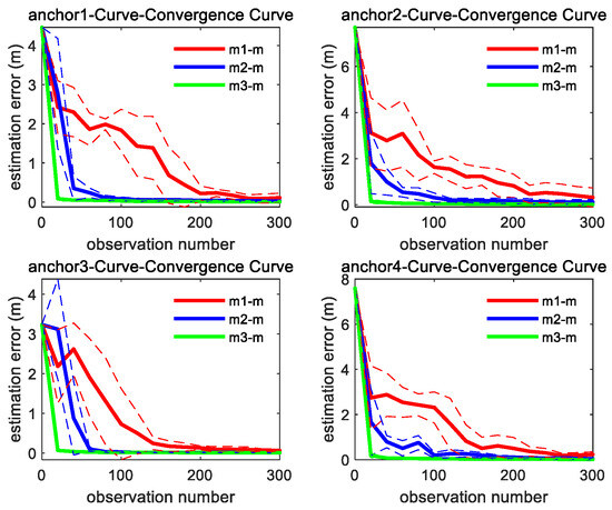 Convergence curve of four anchors’ position estimation under curve motion trajectory; the solid line represents the mean of the 10 sets of data estimation results, and the same color dashed line represents the corresponding variance fluctuation results.