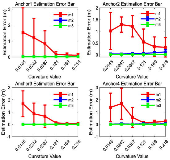 The estimated position results for anchors 1, 2, 3, and 4 are shown in Figure 9 for comparison. As demonstrated in Figure 9, the position estimation error of m1 exhibits an inverse relationship with trajectory curvature: the higher the curvature of the motion trajectory is, the smaller the position estimation error will be. If the curvature of the motion trajectory is big enough, m1 attains comparable positioning accuracy to m2 and m3. It is worth noting that the estimation performance of m2 and m3 is less affected by curvature changes. This result proves that the anchor position estimation method proposed in this paper improves the position estimation accuracy effectively for linear or small-curvature trajectories.