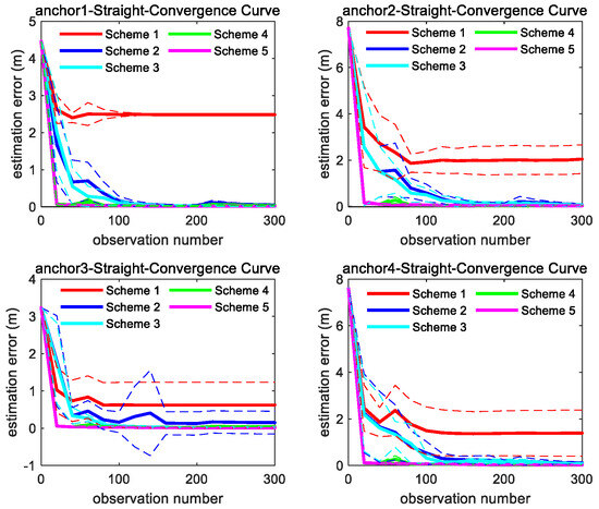 Convergence curve of four anchors’ position estimation under straight trajectory; the solid line represents the mean of the 10 sets of data estimation results, and the same color dashed line represents the corresponding variance fluctuation.