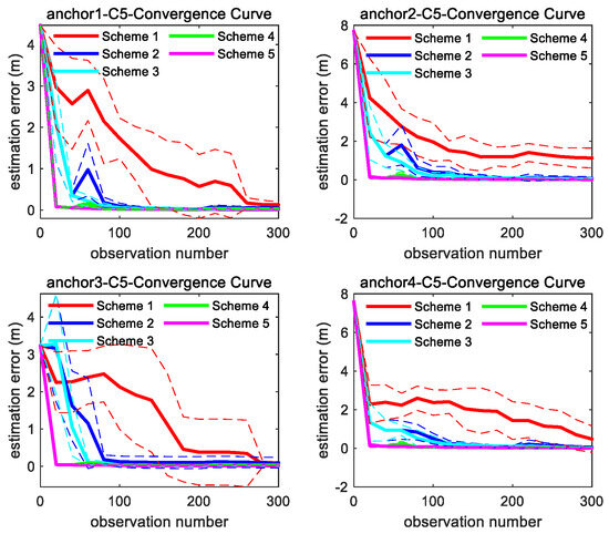 Convergence curve of four anchors’ position estimation under C5 trajectory in Figure 8; the solid line represents the mean of the 10 sets of data estimation results, and the same color dashed line represents the corresponding variance fluctuation of the 10 sets of data estimation results.