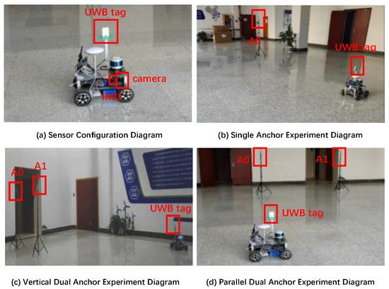 To validate the accuracy of the proposed anchor position estimation algorithm in practical scenarios, we conducted real ground vehicle experiments encompassing single-anchor and dual-anchor localization with unknown position. In order to evaluate the possible influence of anchor deployment on estimation results, the dual-anchor configurations are in two distinct geometric arrangements, i.e., one is side by side or parallel, the other is front and back or vertical. The experimental setup details are presented in Figure 14.