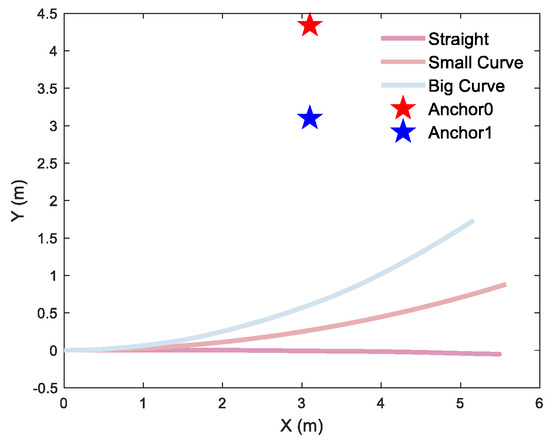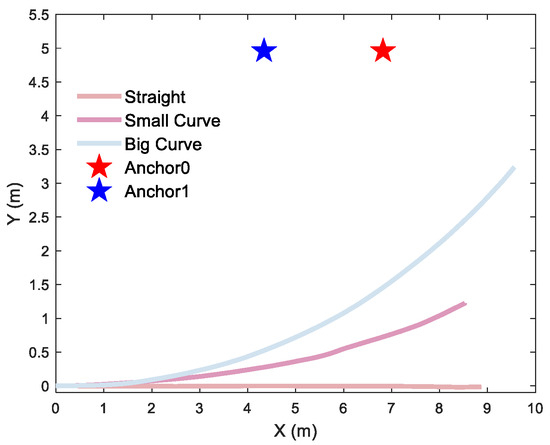 Different motion trajectories of a single anchor: a 2D straight trajectory and a 2D curve trajectory with a curvature radius of 19 m and 10 m, respectively.
