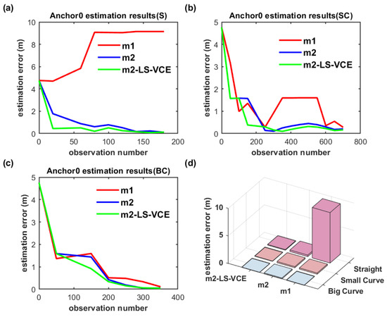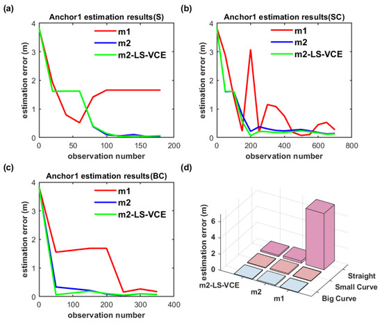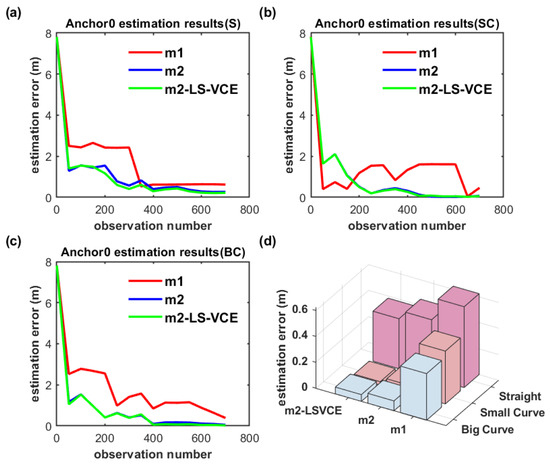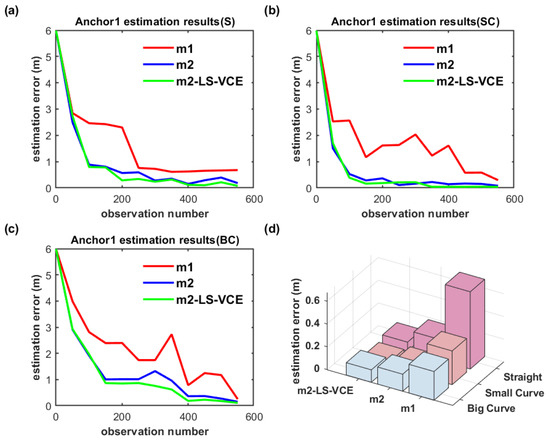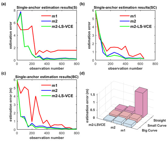 As shown in Figure 21a–c and Figure 22a–c, on the convergence speed and position estimation accuracy of the three methods, similar results to the dual-anchor vertical deployment experiment are achieved. Comparing to m2, the position estimation accuracy of Anchor0 using m2-LS-VCE for straight, small-curvature, and big-curvature trajectories under parallel deployment has been improved by 14.4%, 59.2%, and 31.6%, respectively, as shown in Figure 21d, and the position estimation accuracy of Anchor1 using m2-LS-VCE for straight, small-curvature and big-curvature trajectories under parallel deployment has been improved by 57.4%, 49.5%, and 27.4%, respectively, as shown in Figure 22d.