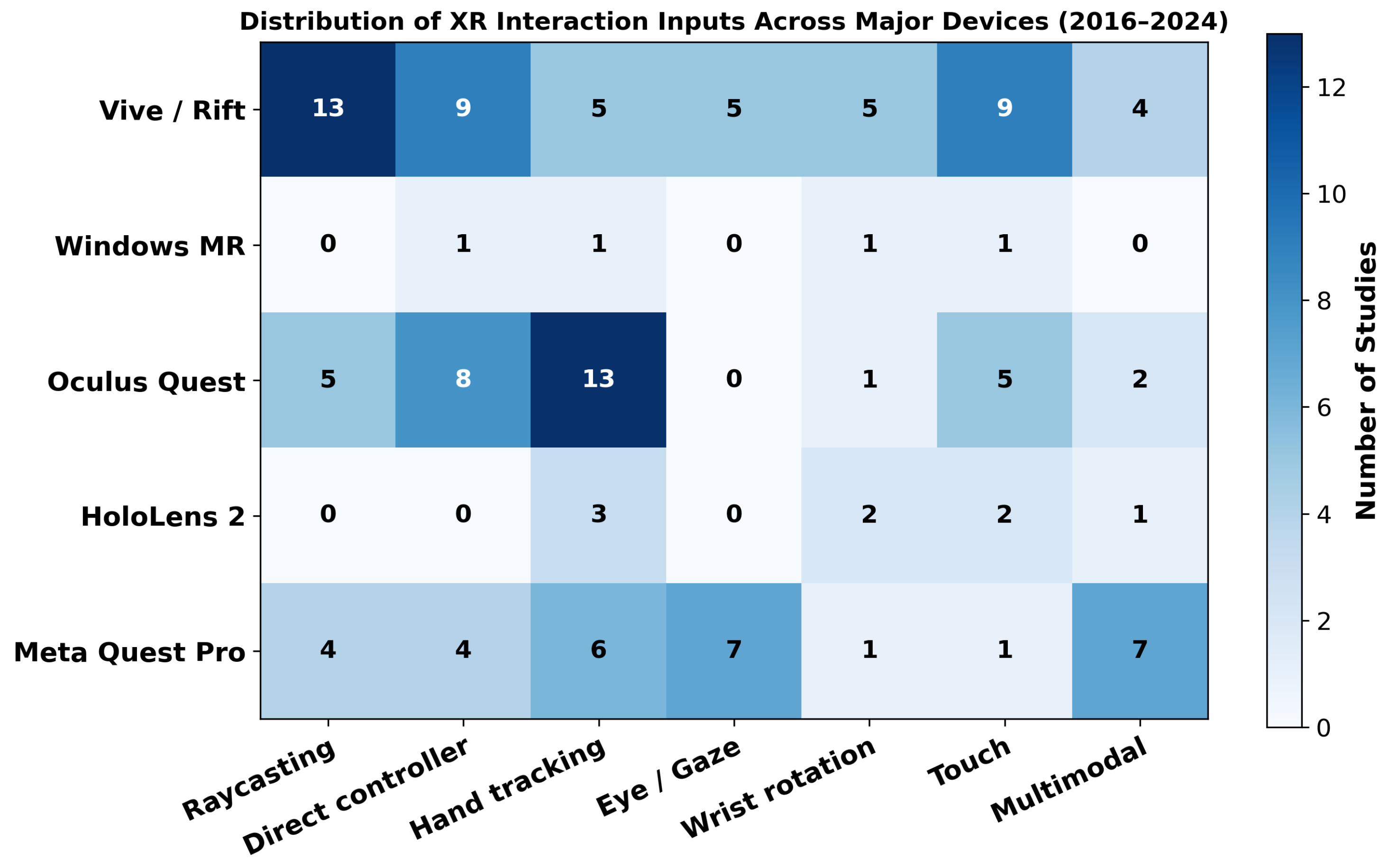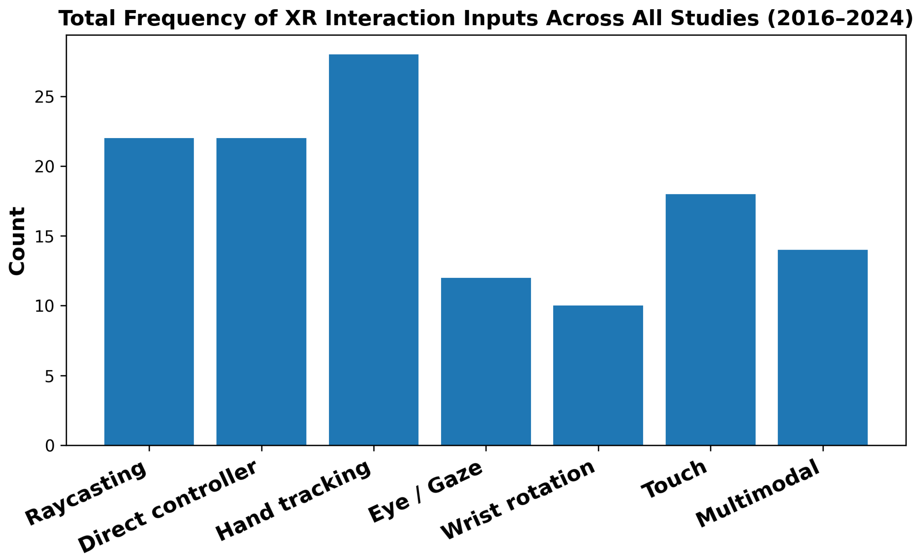- RQ3. What technological constraints and affordances introduced by XR devices and SDKs appear to influence the adoption of interaction techniques, and what implications do these trends suggest for future multimodal XR interaction design?
