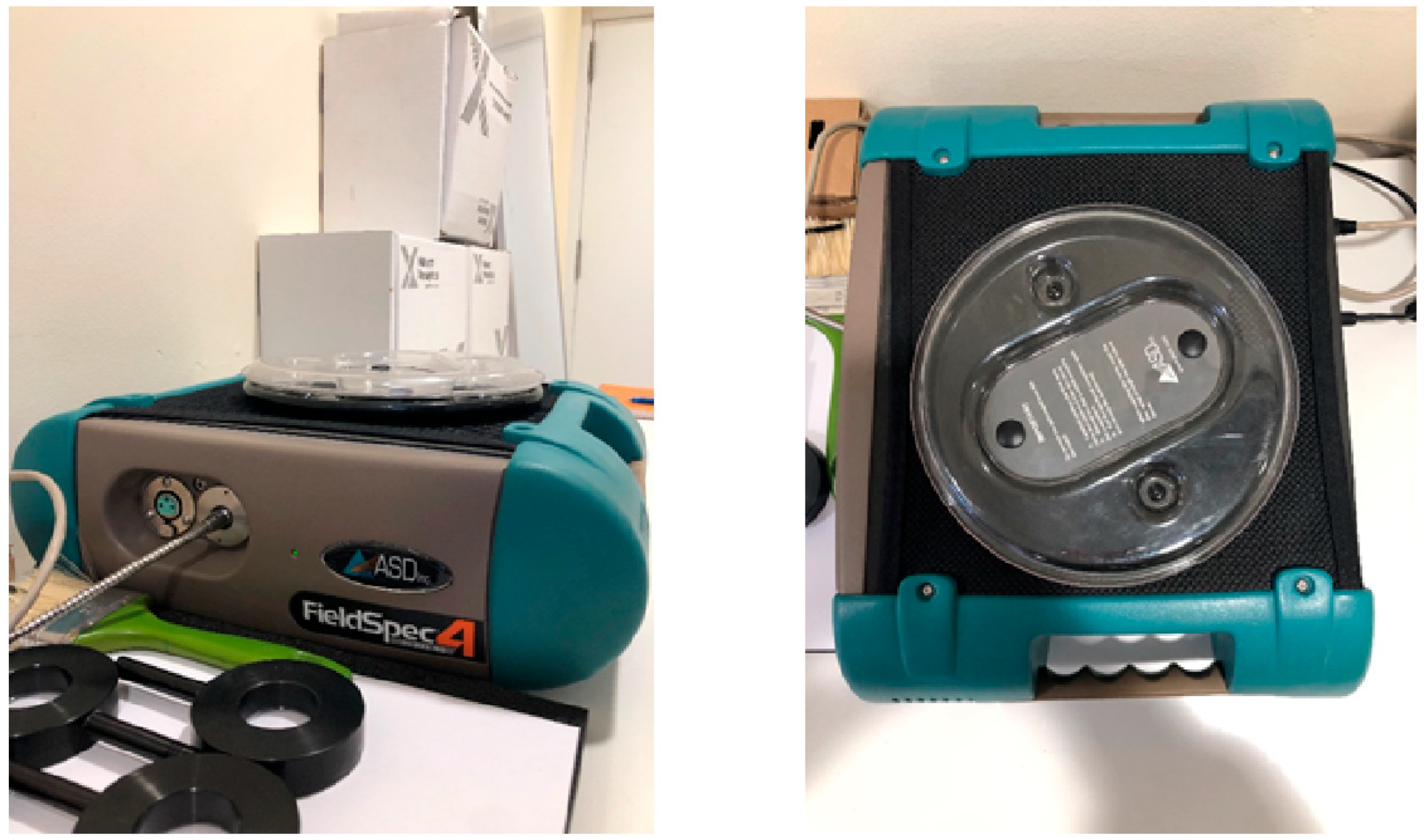 We collected the reflectance spectra using an ASD FieldSpec® 4 Hi-Res NG spectroradiometer (Analytical Spectral Devices Inc., Boulder, CO, USA), as illustrated in