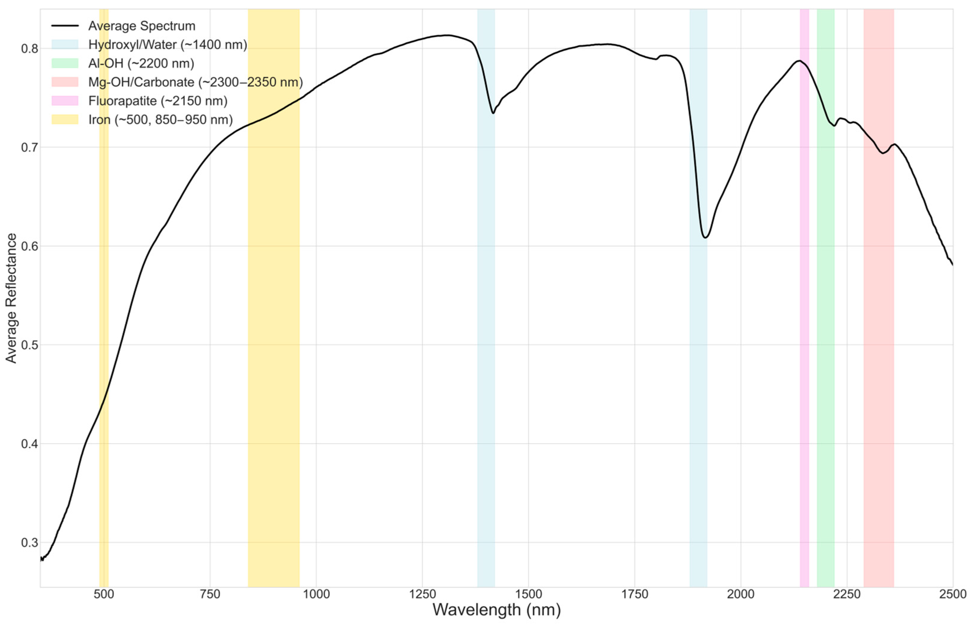 To address this gap, rapid analytical techniques such as reflectance spectroscopy and portable X-ray fluorescence offer powerful alternatives for large-scale characterizations. VNIR-SWIR reflectance spectroscopy (350–2500 nm) can detect common rock-forming minerals based on diagnostic spectral absorption features arising from molecular vibrations and electronic transitions [