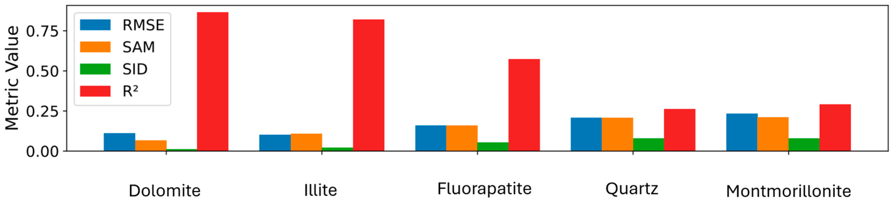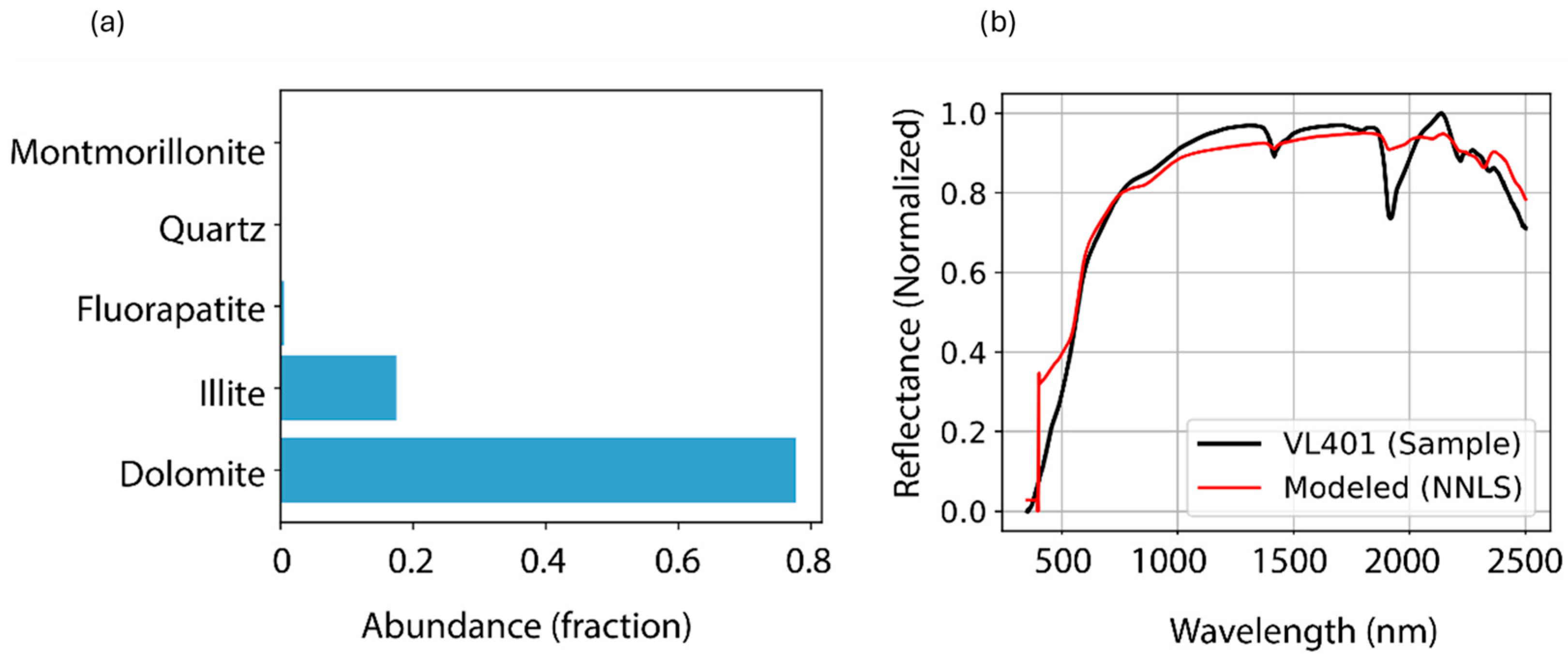 Quartz: Although quartz lacks prominent spectral absorption features in the VNIR-SWIR range, its presence was inferred through its effect on the spectral continuum shape and was validated by the high SiO2 content in the absence of significant Al2O3 or other major cation oxides. This was particularly relevant for samples in which quartz was modeled as a minor endmember.