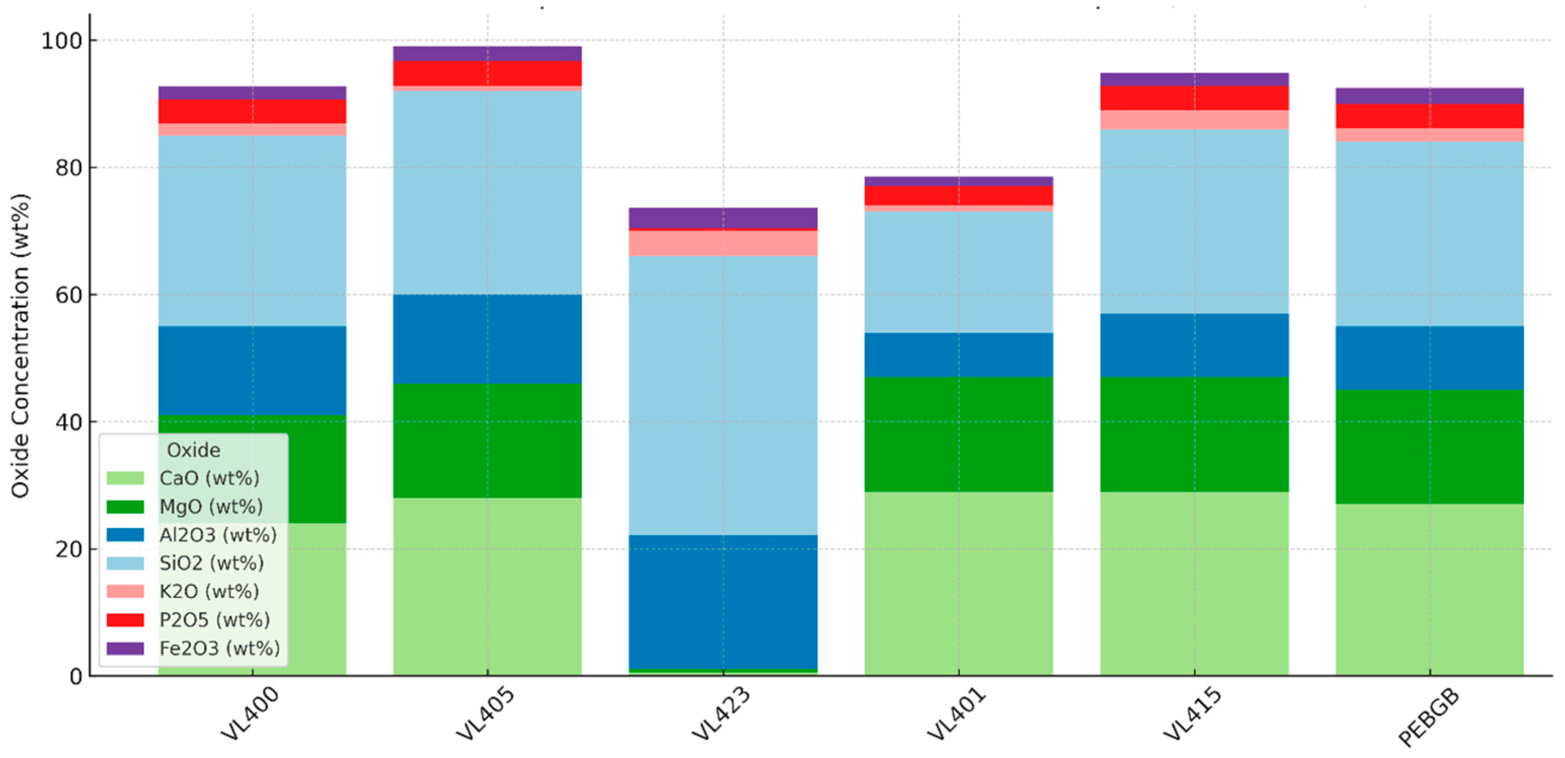 The HHXRF data revealed substantial compositional variability across the samples. The concentration ranges (expressed as oxides, based on common reporting conventions) were illustrated in