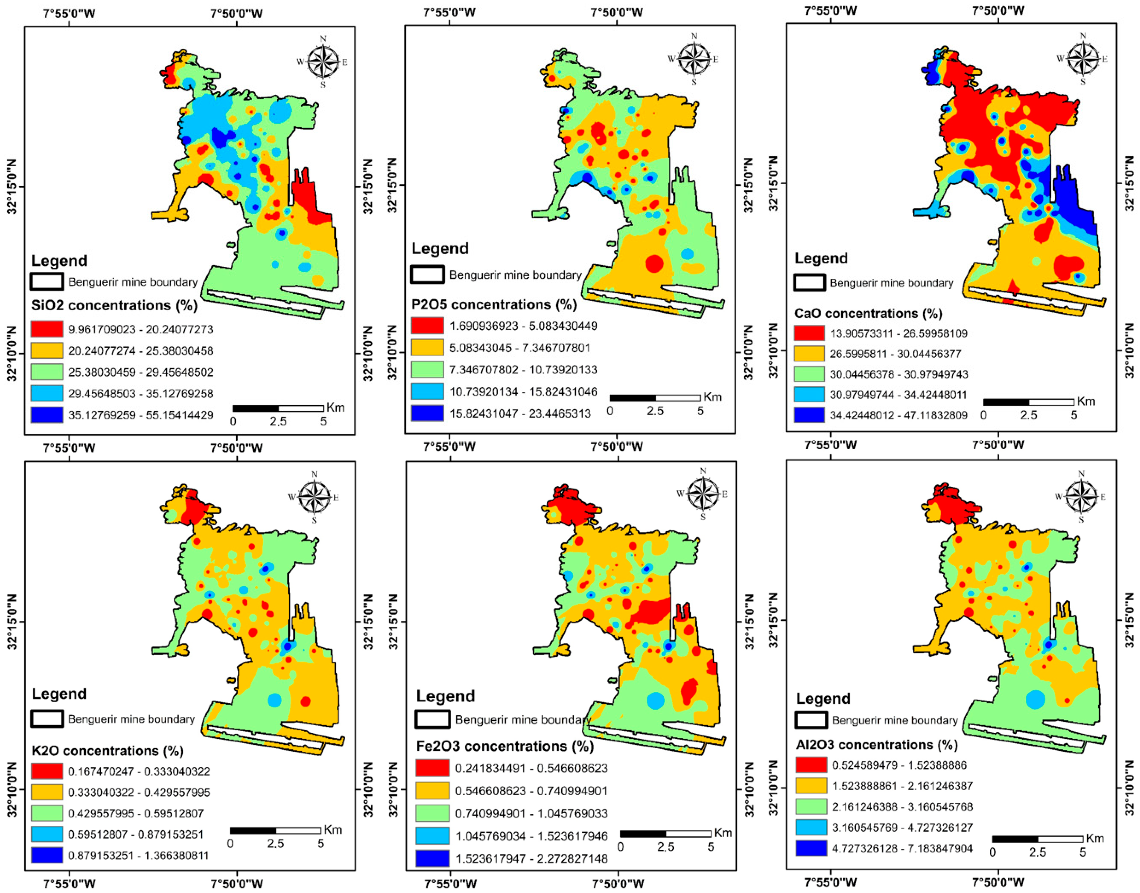 Figure 11) summarizes the main lithological domains—carbonate-rich, clay-dominated, phosphate-rich, ferruginous, and siliceous—highlighting broad carbonate belts, clay/Fe zones, and localized phosphate areas across the Benguerir mine. Together, these maps synthesize geochemical and mineralogical variability at the site and naturally lead into the interpretation developed in
