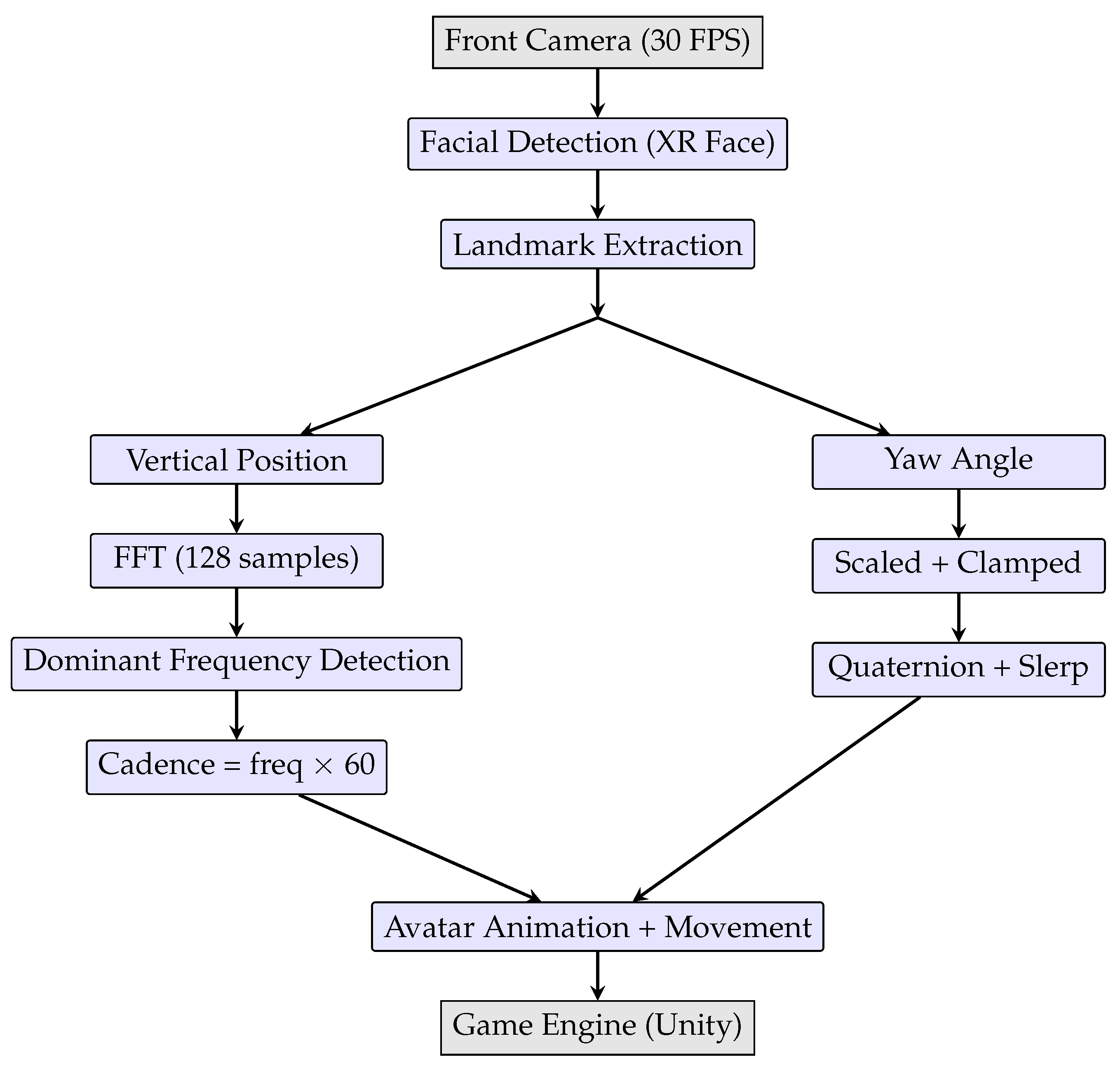The dominant frequency represents the runner’s cadence in steps per second, which was then multiplied by 60 to express cadence in steps per minute. This value was used to control both the avatar’s animation playback speed and its forward movement in the game environment.