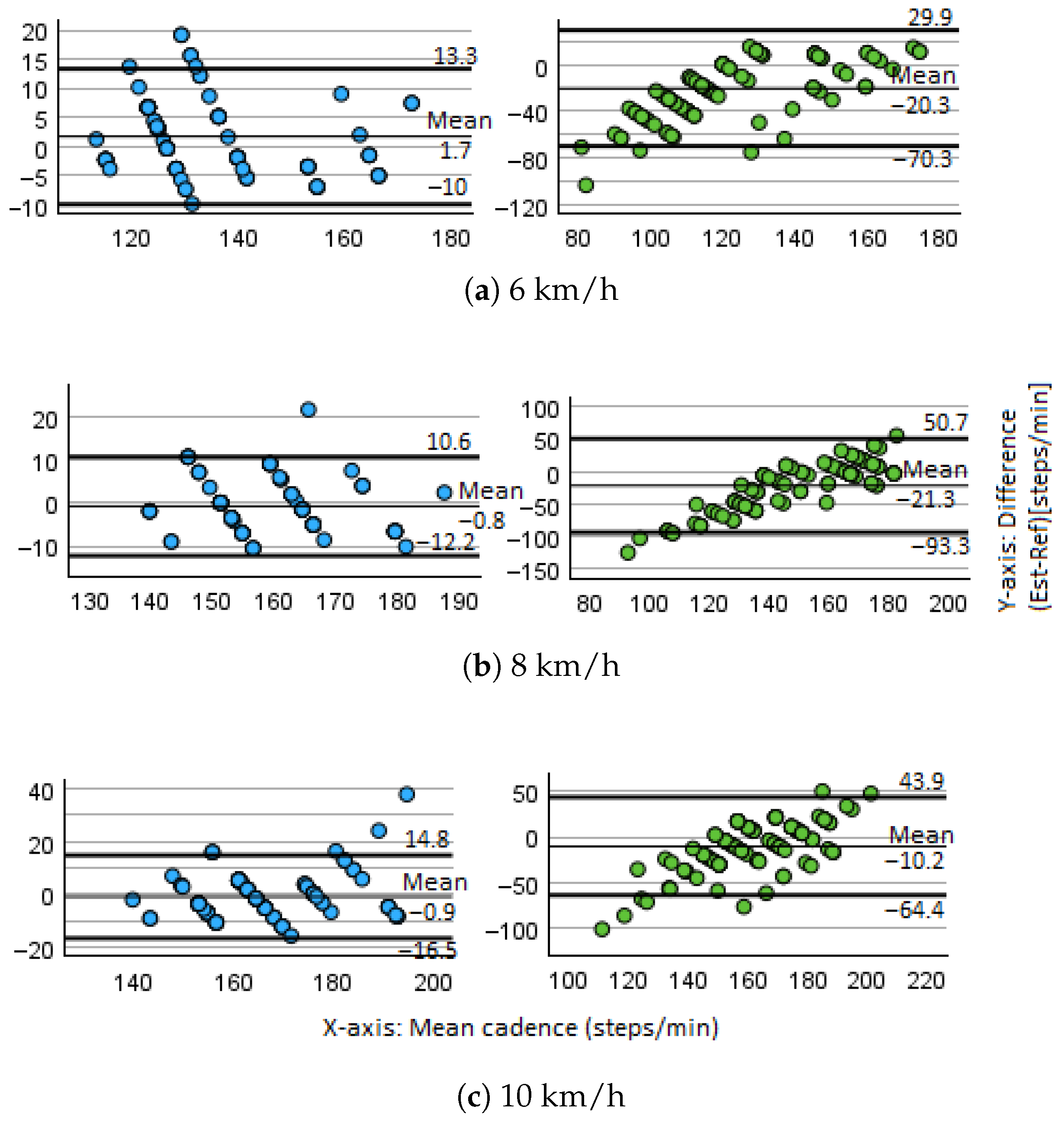 Agreement between estimated and actual cadence values was further assessed using Bland–Altman plots. These illustrate the difference versus the mean of the two measures, providing insight into systematic bias and limits of agreement.