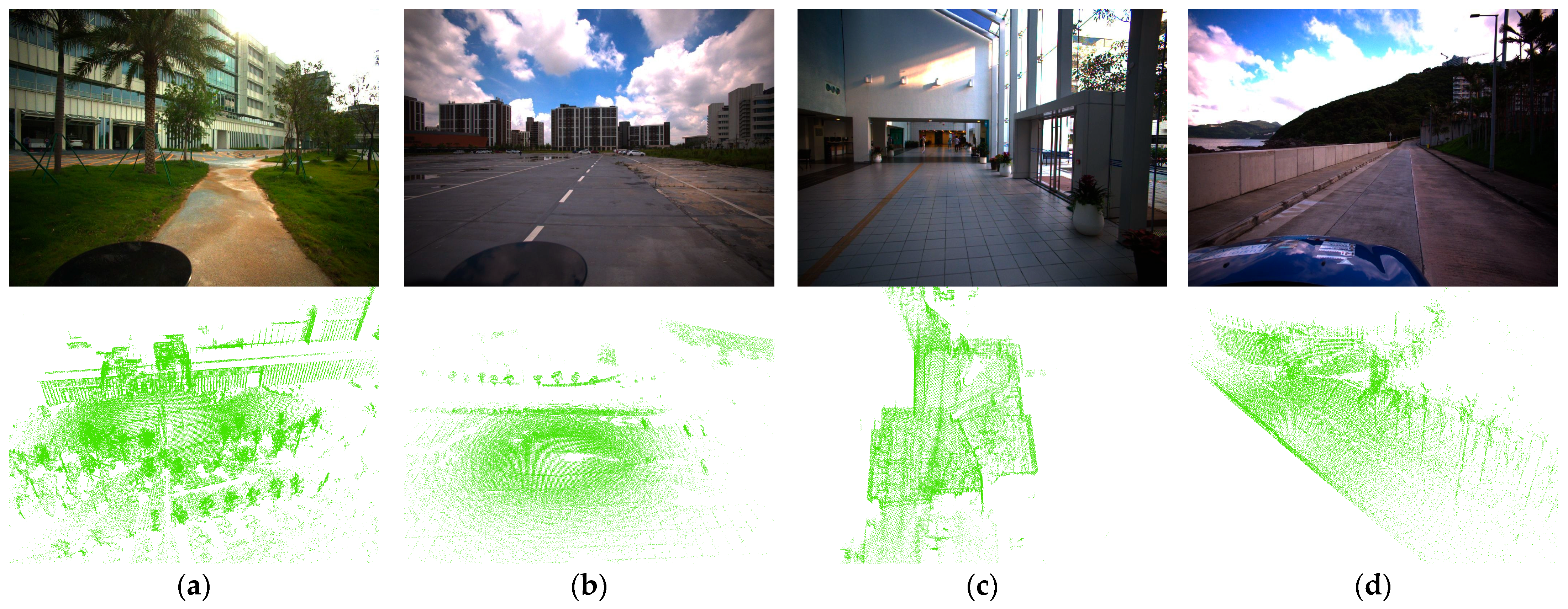 - Jiao, J.; Wei, H.; Hu, T.; Hu, X.; Zhu, Y.; He, Z.; Wu, J.; Yu, J.; Xie, X.; Huang, H.; et al. FusionPortable: A Multi-Sensor Campus-Scene Dataset for Evaluation of Localization and Mapping Accuracy on Diverse Platforms. In Proceedings of the 2022 IEEE/RSJ International Conference on Intelligent Robots and Systems (IROS), Kyoto, Japan, 23–27 October 2022; pp. 3851–3856. [Google Scholar]