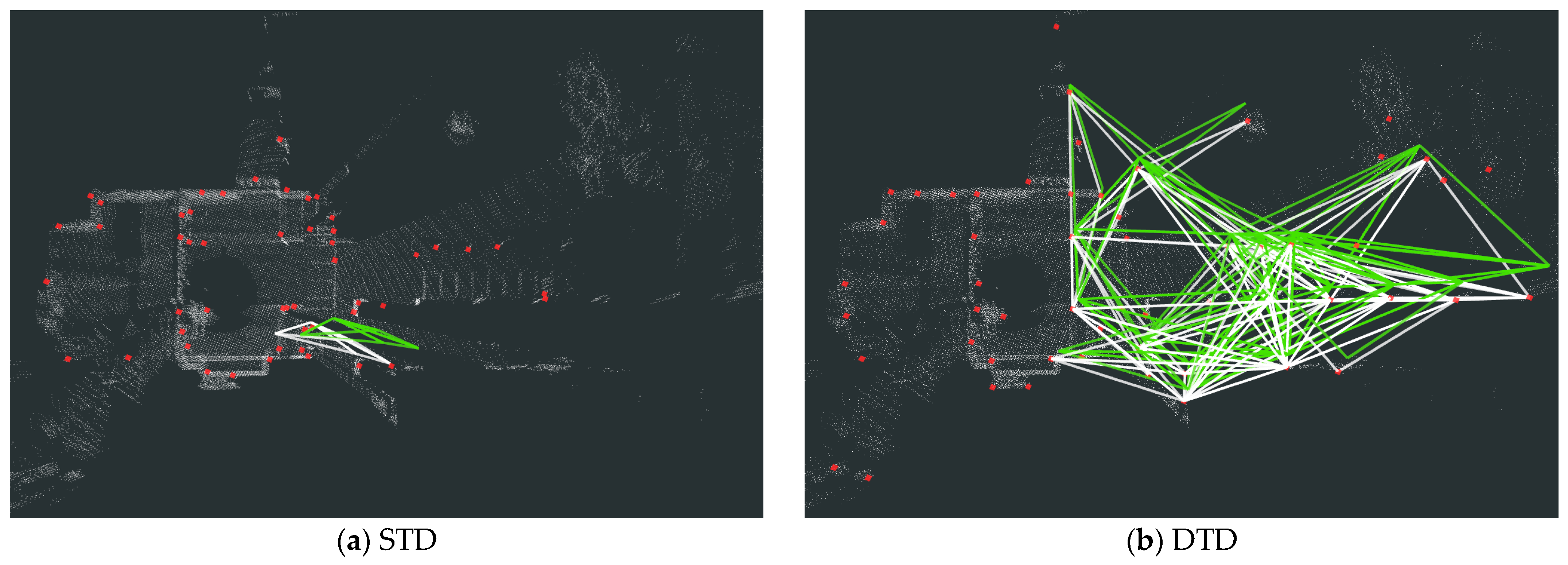- Yuan, C.; Lin, J.; Zou, Z.; Hong, X.; Zhang, F. STD: Stable Triangle Descriptor for 3D place recognition. In Proceedings of the 2023 IEEE International Conference on Robotics and Automation (ICRA), London, UK, 29 May–2 June 2023; pp. 1897–1903. [Google Scholar]