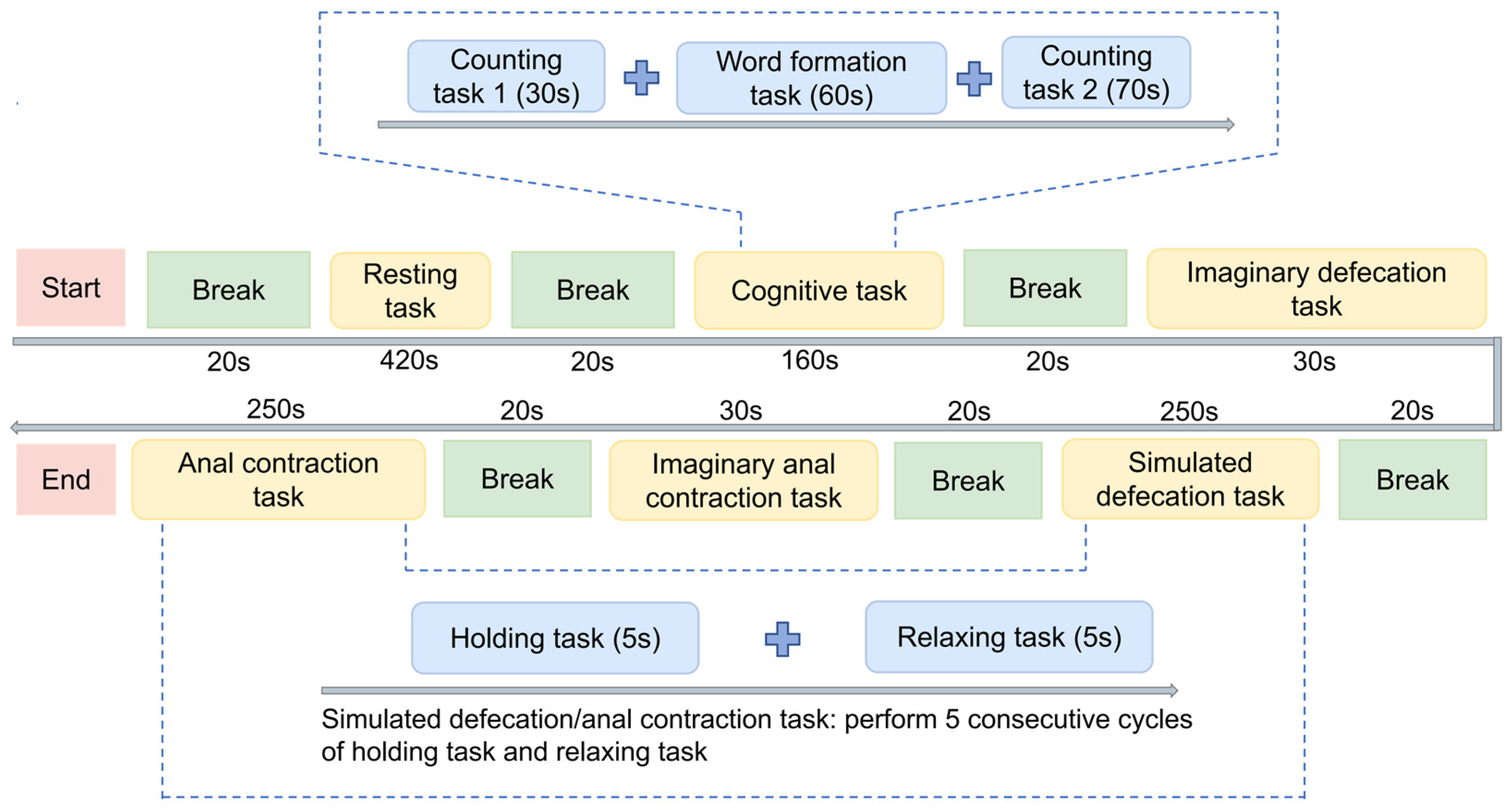 - Defecation-related tasks: Participants performed an imaginary defecation task (30 s; imagining the act of defecation without any actual movement) and a simulated defecation task (250 s; performing a Valsalva maneuver that requires breath-holding and increased abdominal pressure to mimic defecation [21]), which consisted of five consecutive cycles of holding and relaxing tasks. Then, the paradigm included an imaginary anal contraction task (30 s; imagining anal contraction without any actual movement) and an anal contraction task (250 s; performing voluntary anal contraction with kinematic verification via surface electromyography (sEMG)), which also consisted of five cycles of voluntary holding and relaxing tasks. These defecation-related tasks were included to elicit neural activity associated with defecation-related motor control while differentiating between ideomotor representation (imagery) and actual physiological strain. All tasks were performed with eyes open.
