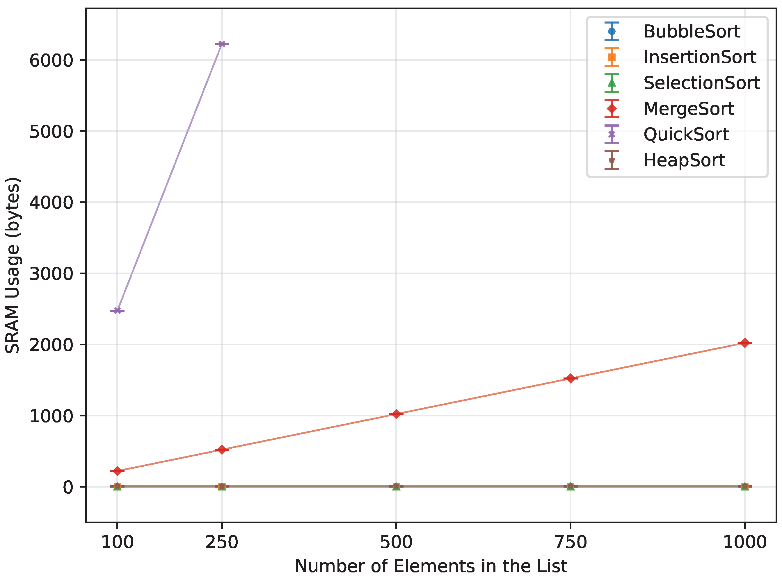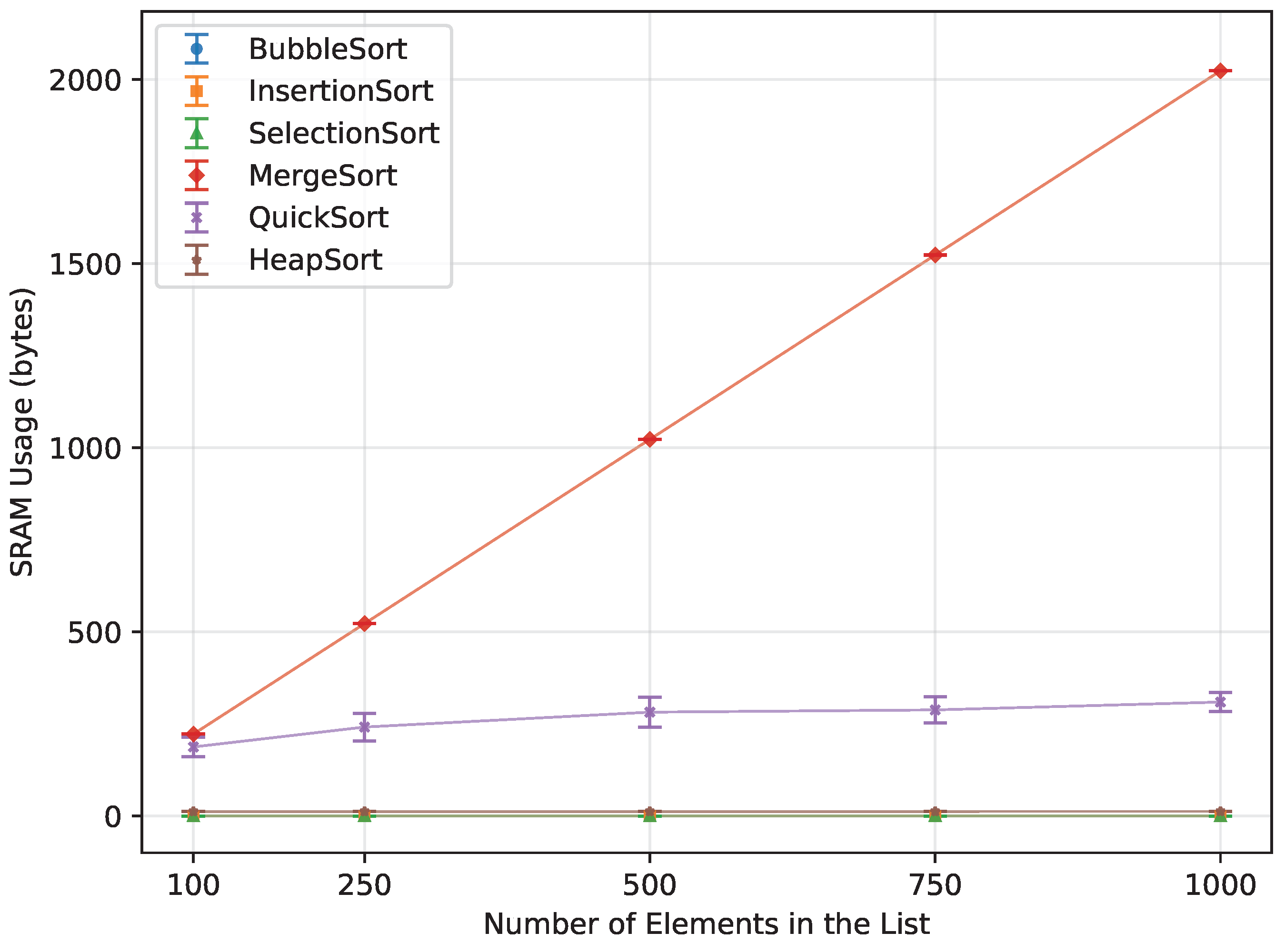 In contrast to these prior efforts, the present study deliberately evaluates unmodified, textbook implementations of six well-known sorting algorithms on low-end 8-bit AVR-based Arduino boards. Rather than proposing new external-memory or hardware-accelerated techniques, we aim to establish a reproducible baseline for how these algorithms behave under strict SRAM constraints that are typical for low-cost sensing nodes. The proposed metrics—execution time, number of array-element writes, and measured SRAM usage—complement existing embedded benchmark suites and provide practitioners with guidance for selecting sorting algorithms for simple, RAM-limited microcontroller-based systems.