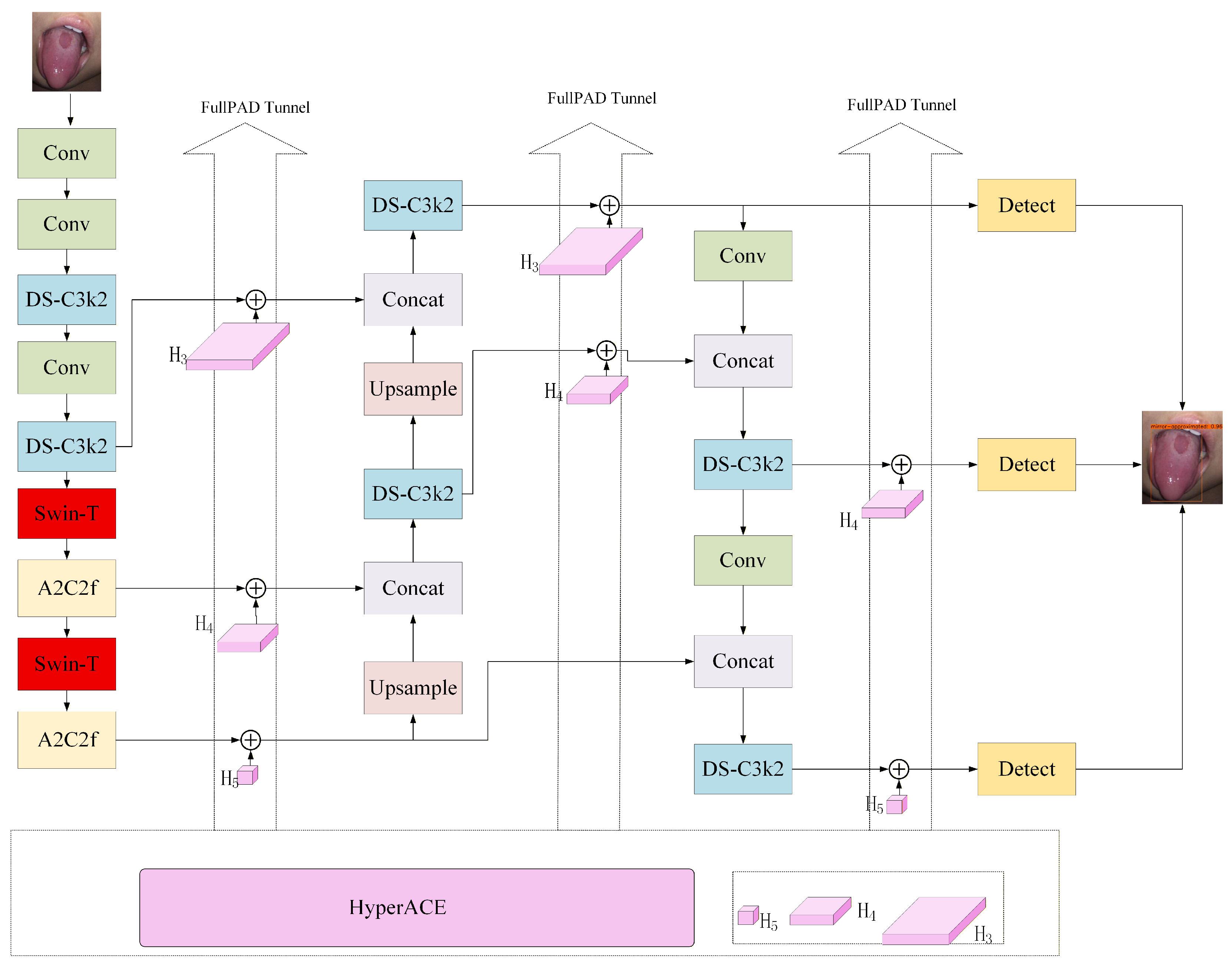 Figure 2, to enhance feature representation for tongue coating images. Swin transformer modules were introduced at critical feature extraction layers of YOLOv13 to capture global contextual information while preserving local feature extraction capabilities.