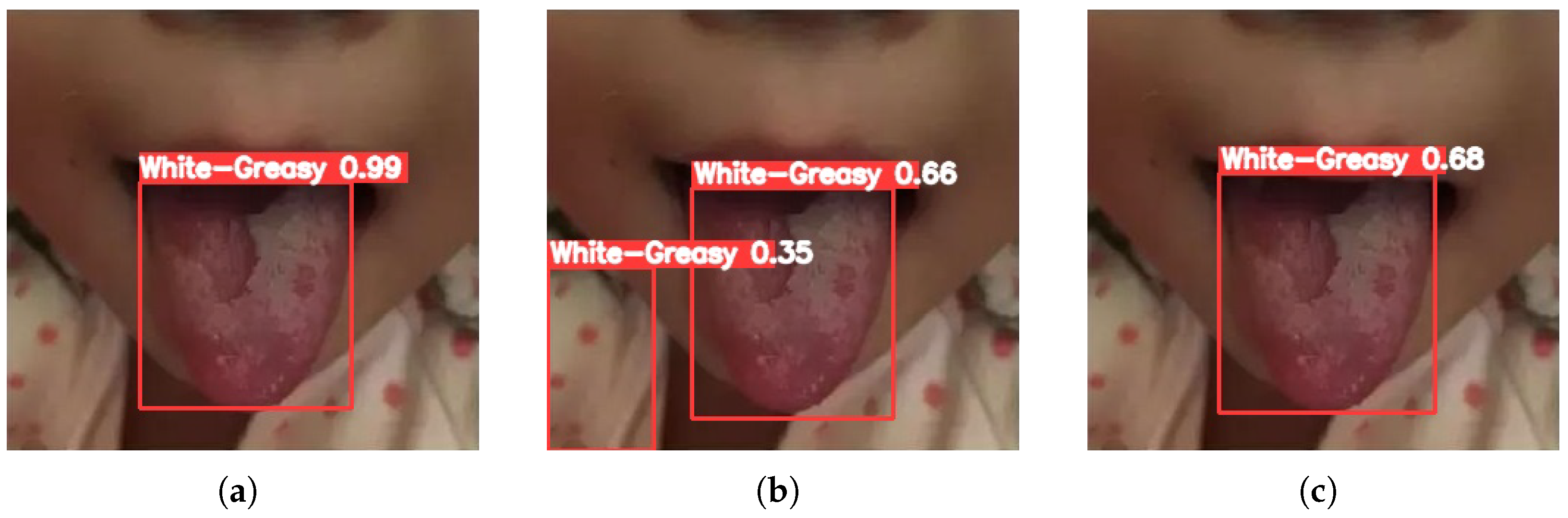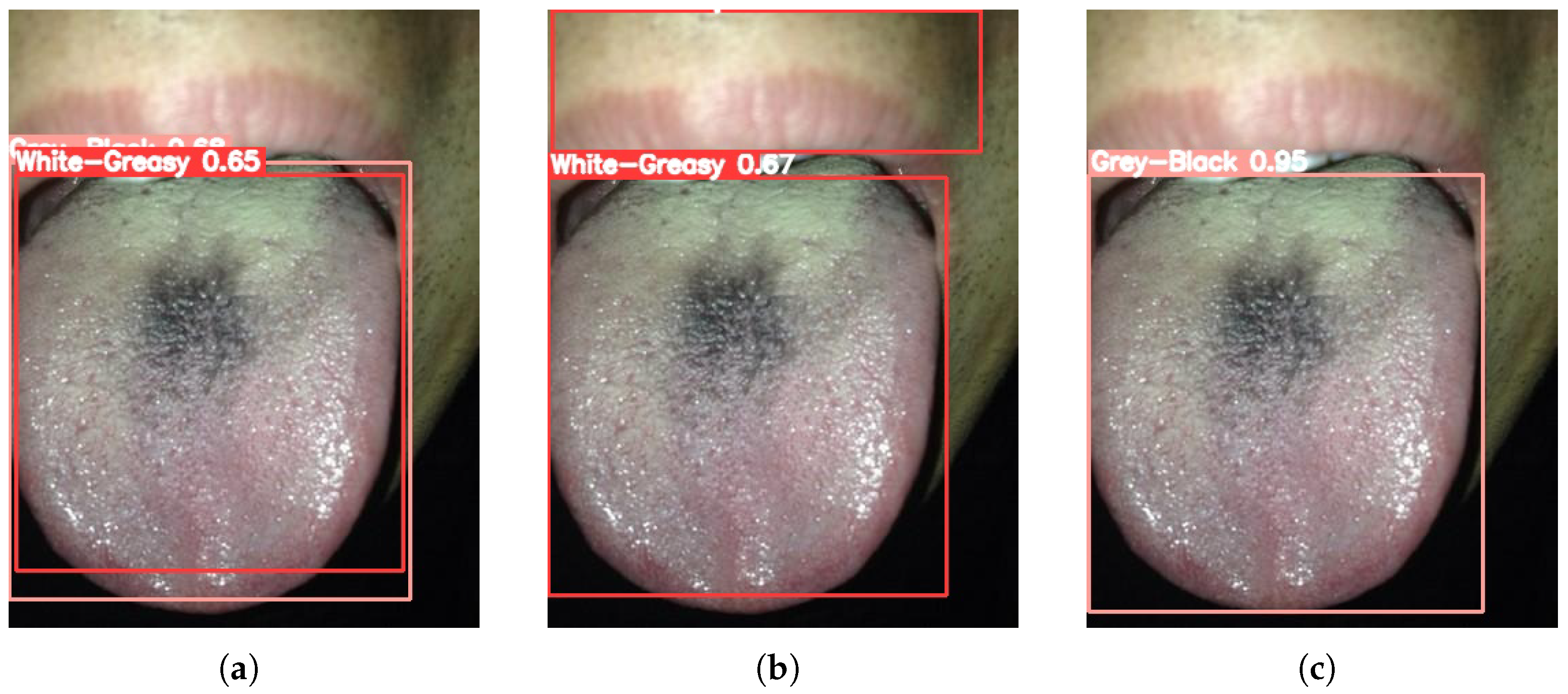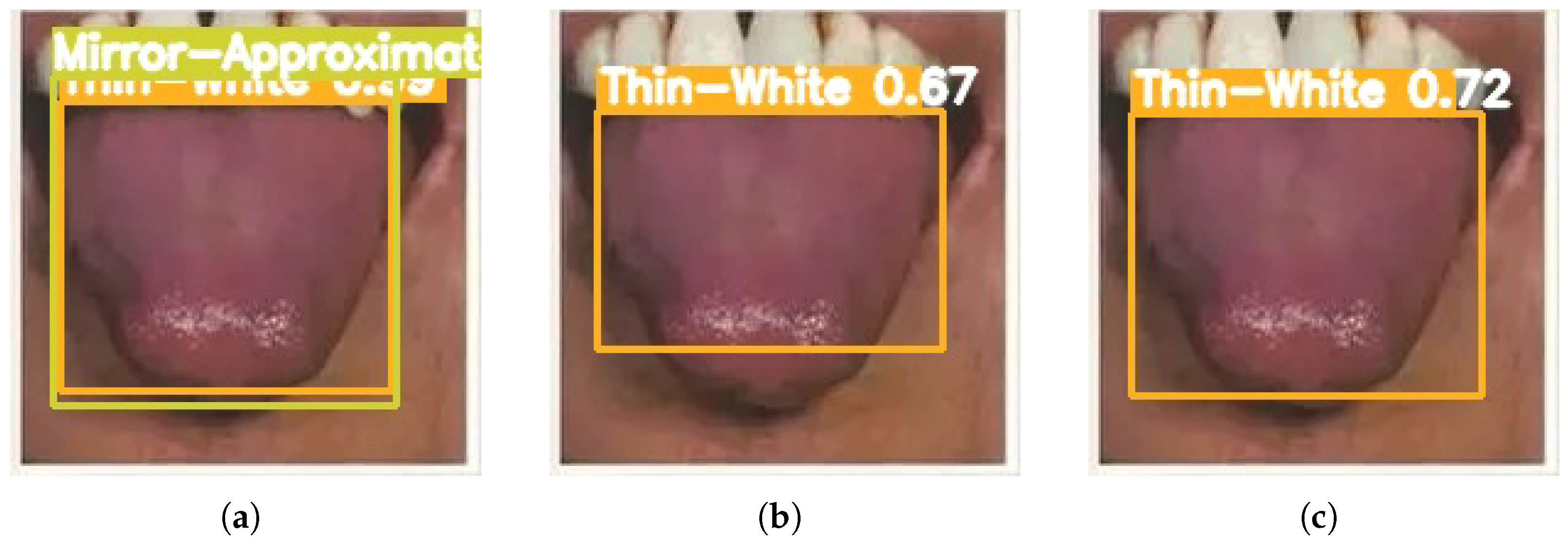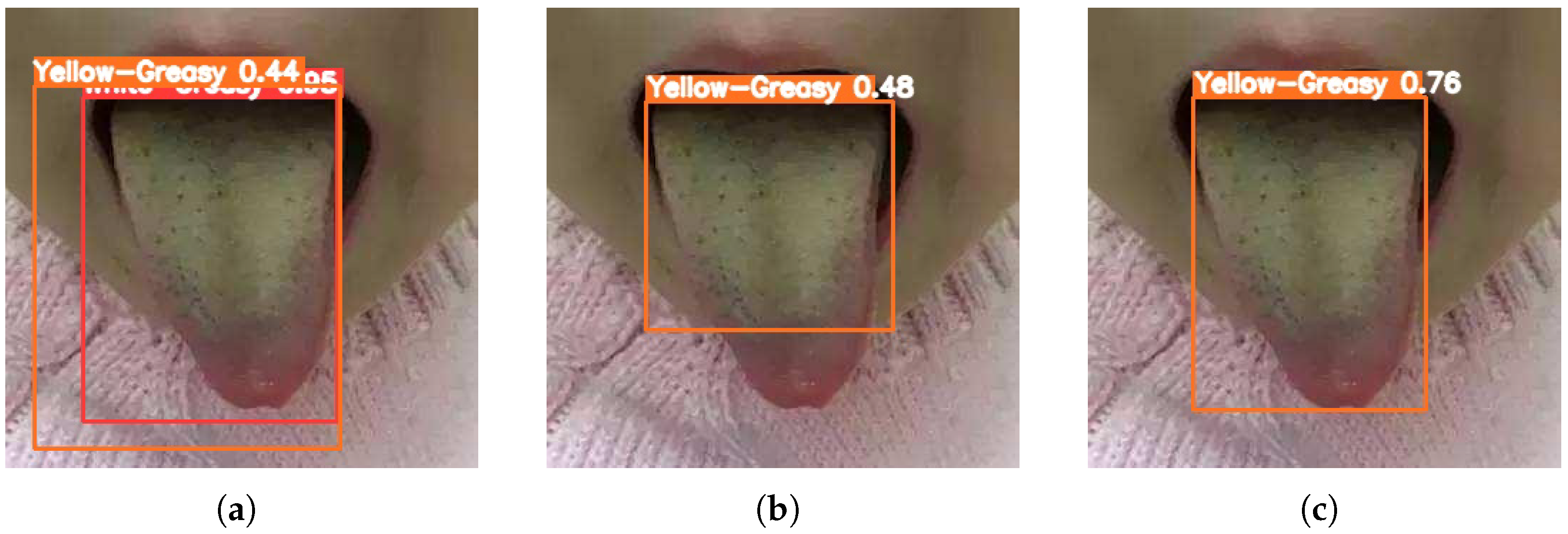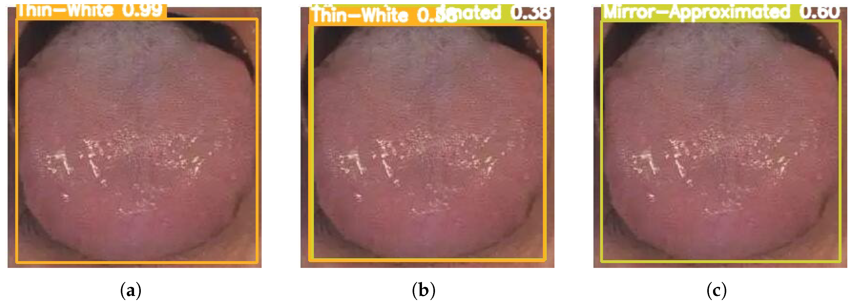 28]—to evaluate detection performance across tongue coating categories. To ensure robustness and generalization, a comprehensive dataset was constructed for training and validation under varying lighting conditions and shooting angles.