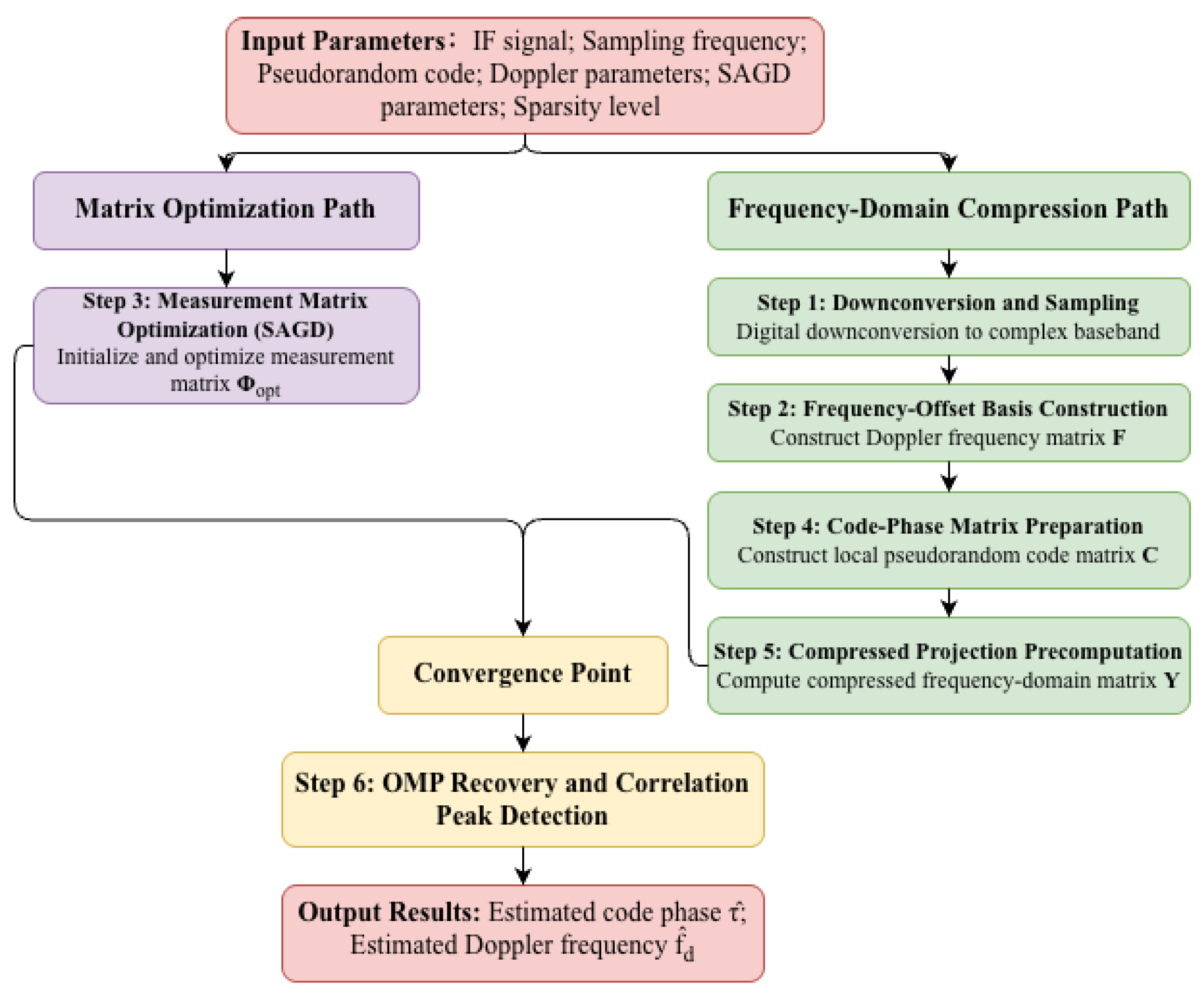 14] incorporated compressive sensing into acquisition algorithms, using the Kronecker product of frequency indices and code phases as a transform matrix for compressed acquisition to reduce acquisition time. However, matrices generated by the Kronecker construction are extremely large, leading to high computational complexity in signal reconstruction. To address this, Zhou et al. [