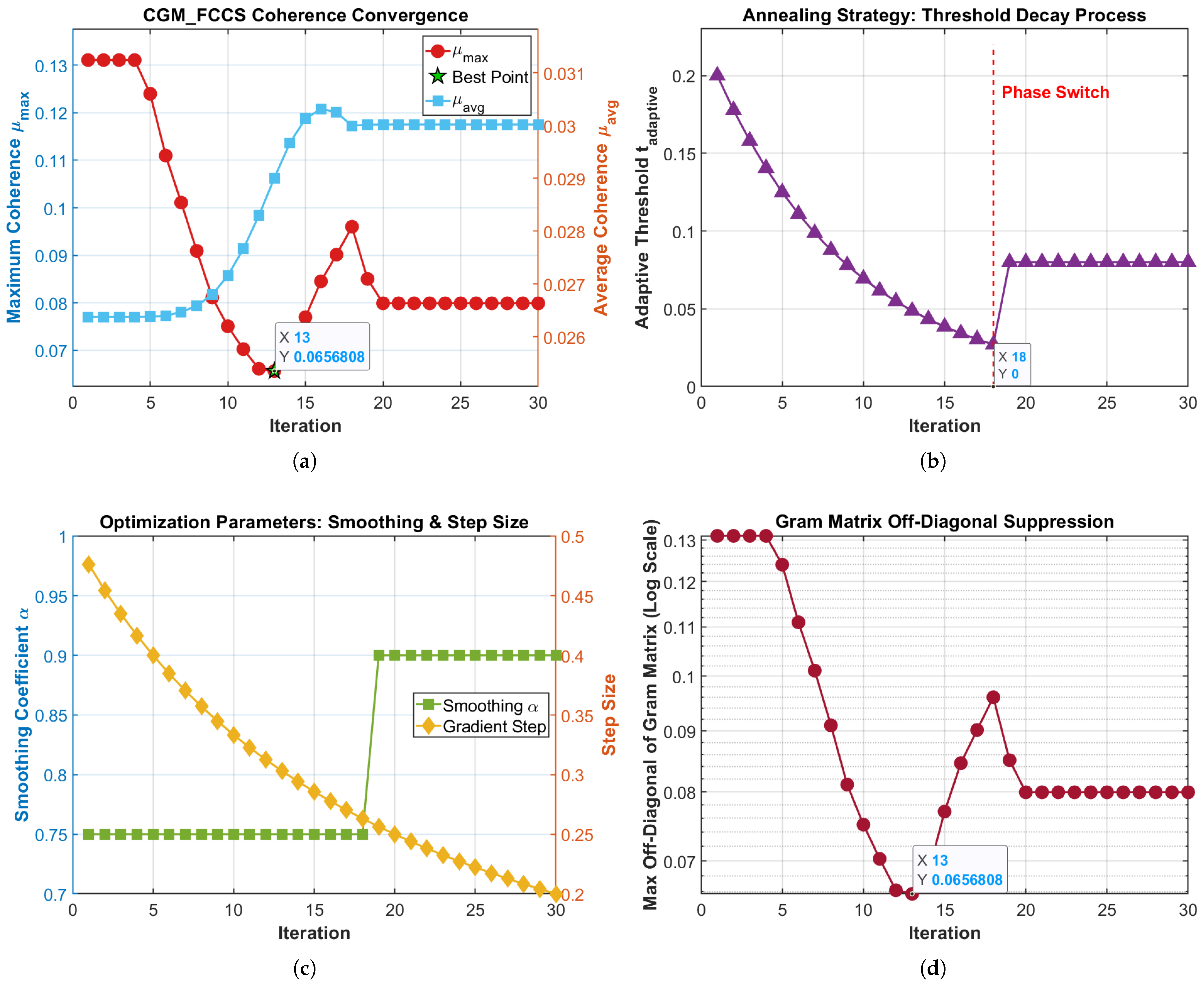 A SAGD-based measurement-matrix design method via Gram matrix shaping with a two-stage annealing schedule, which substantially reduces the maximum mutual coherence compared with common random/structured baselines.
