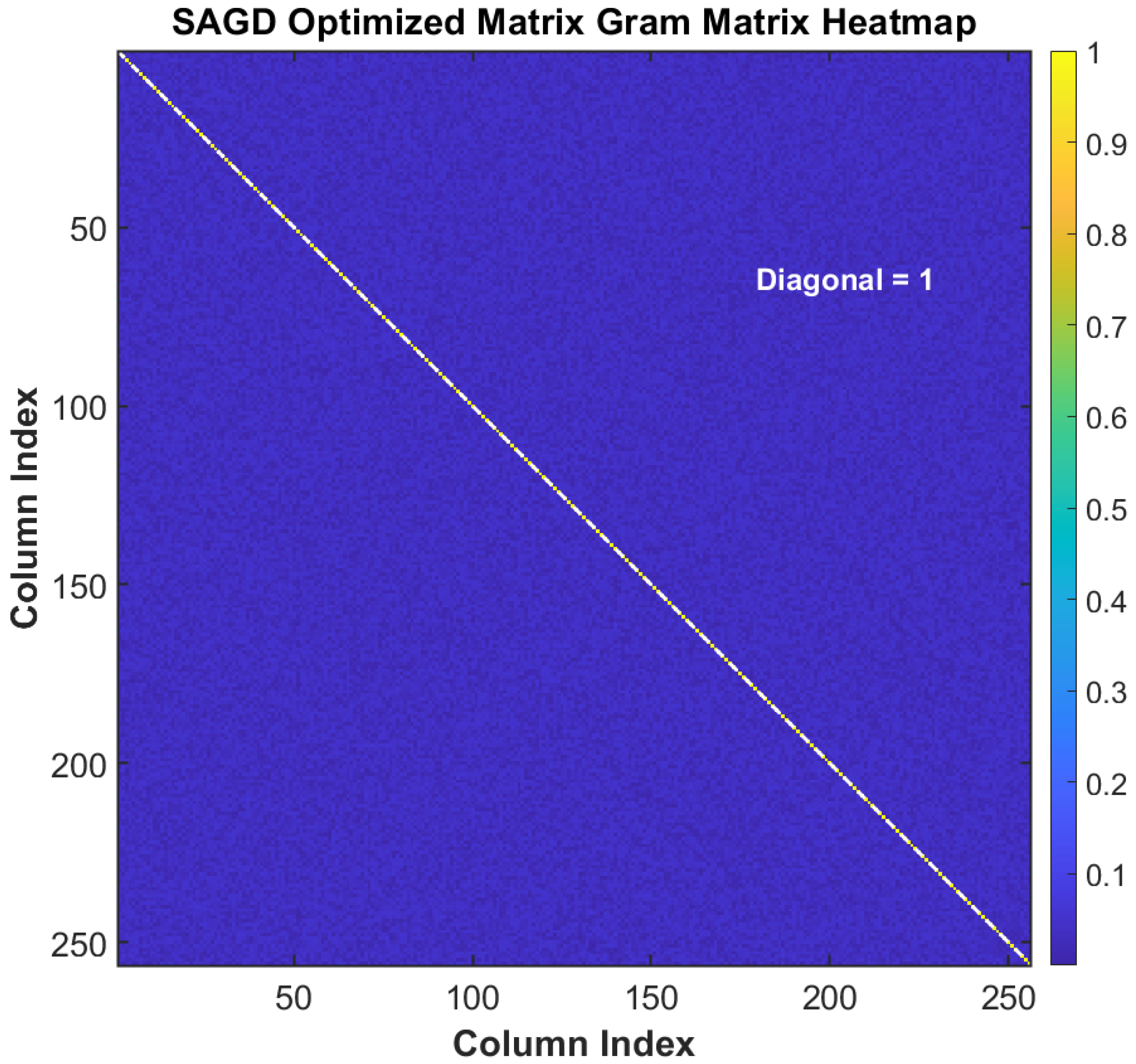 Figure 3. The concentration of off-diagonal Gram entries at smaller magnitudes indicates reduced leakage, which helps improve peak separability in the compressed-domain acquisition decision.