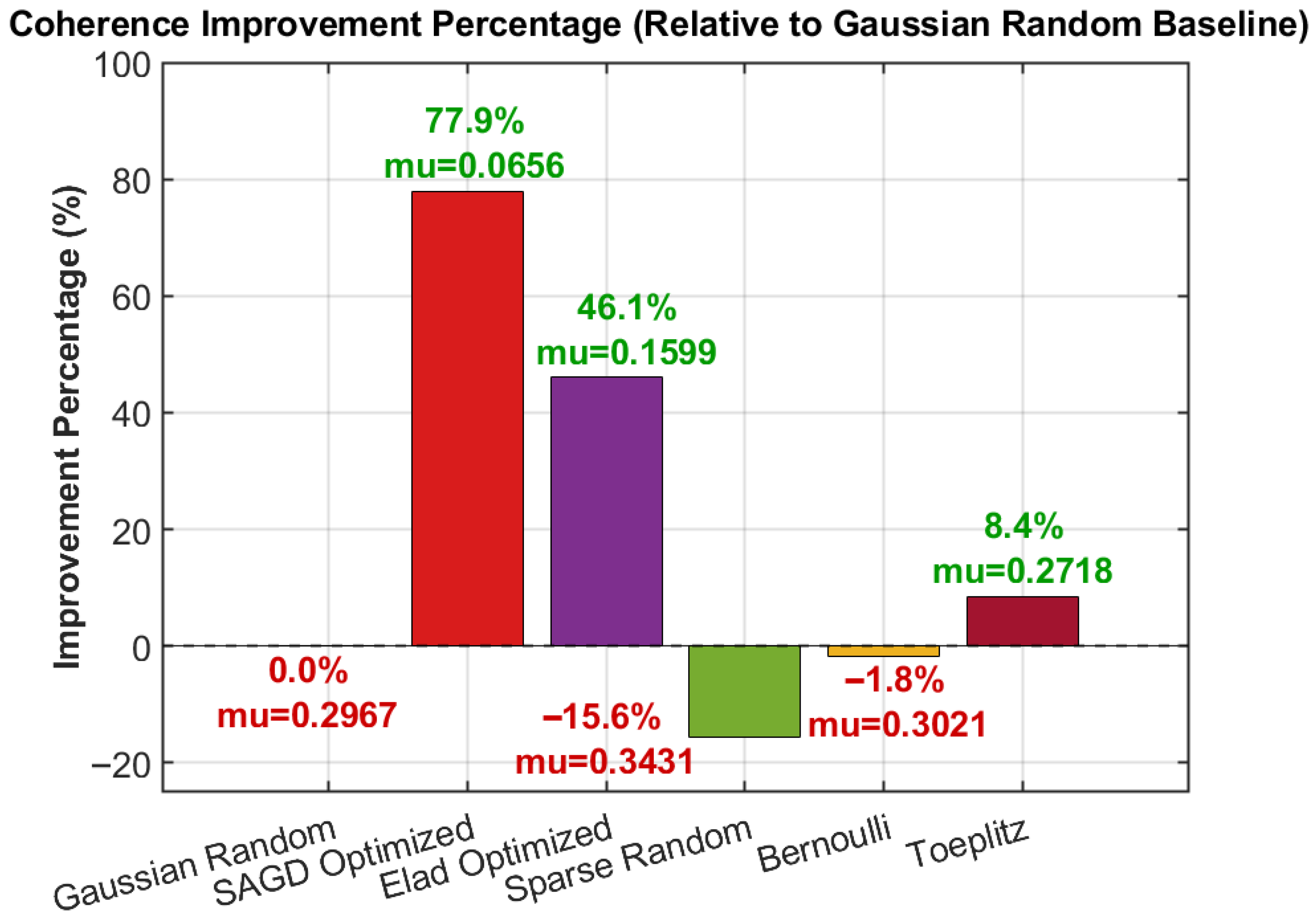Figure 4 quantifies the maximum-coherence improvement relative to the Gaussian-random baseline. The proposed SAGD design achieves the largest improvement, reducing the maximum coherence to the lowest value among all candidates. In comparison, structured (e.g., Toeplitz) and alternative optimization baselines provide only moderate or marginal improvements, while sparse-random/Bernoulli constructions may even degrade the worst-case coherence depending on the realization. These results corroborate that the SAGD optimization effectively suppresses dominant inter-column leakage.