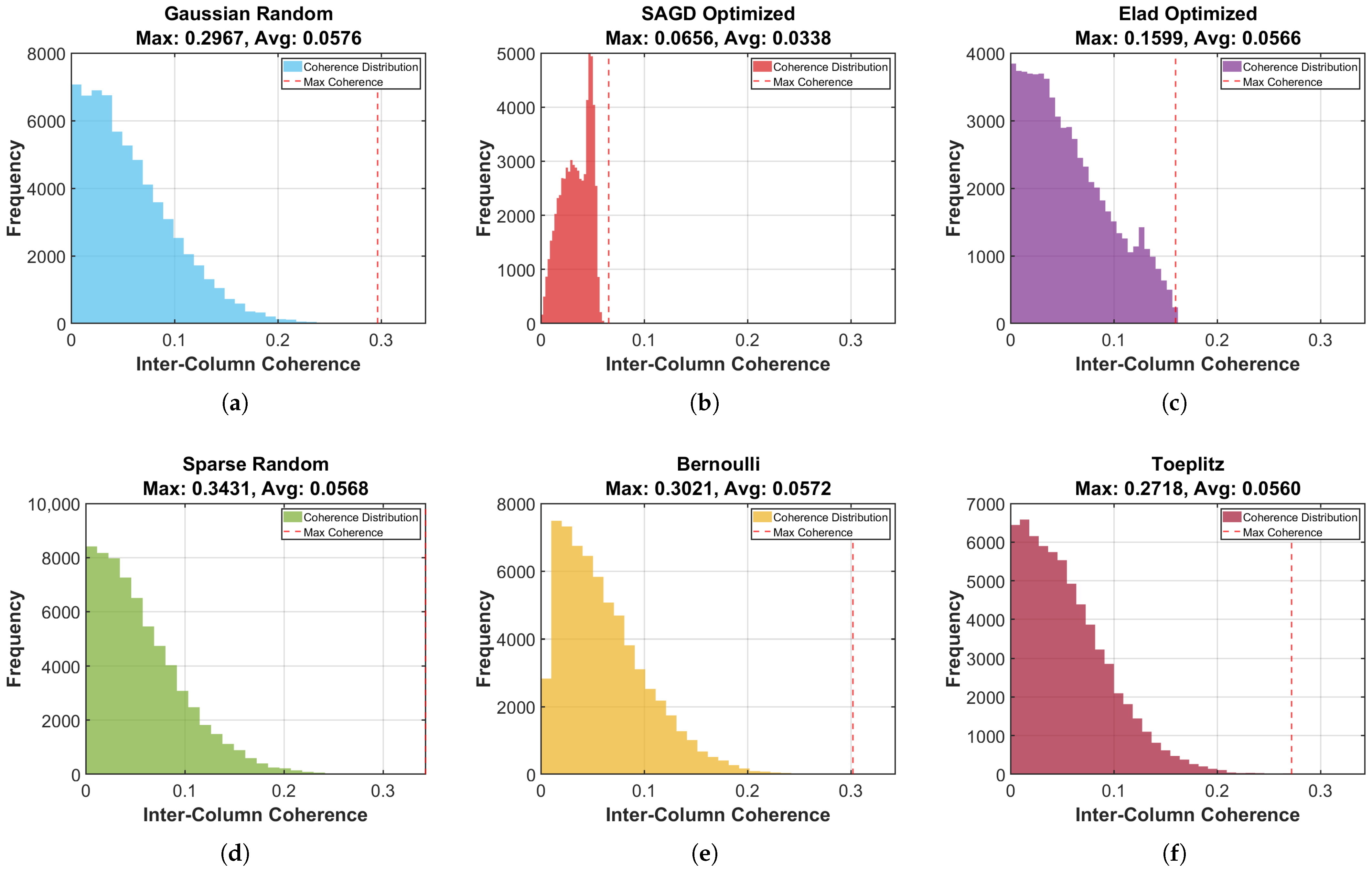 Figure 6 compares six measurement matrices within the FCS framework. The corresponding maximum-coherence values are as follows: Gaussian random (