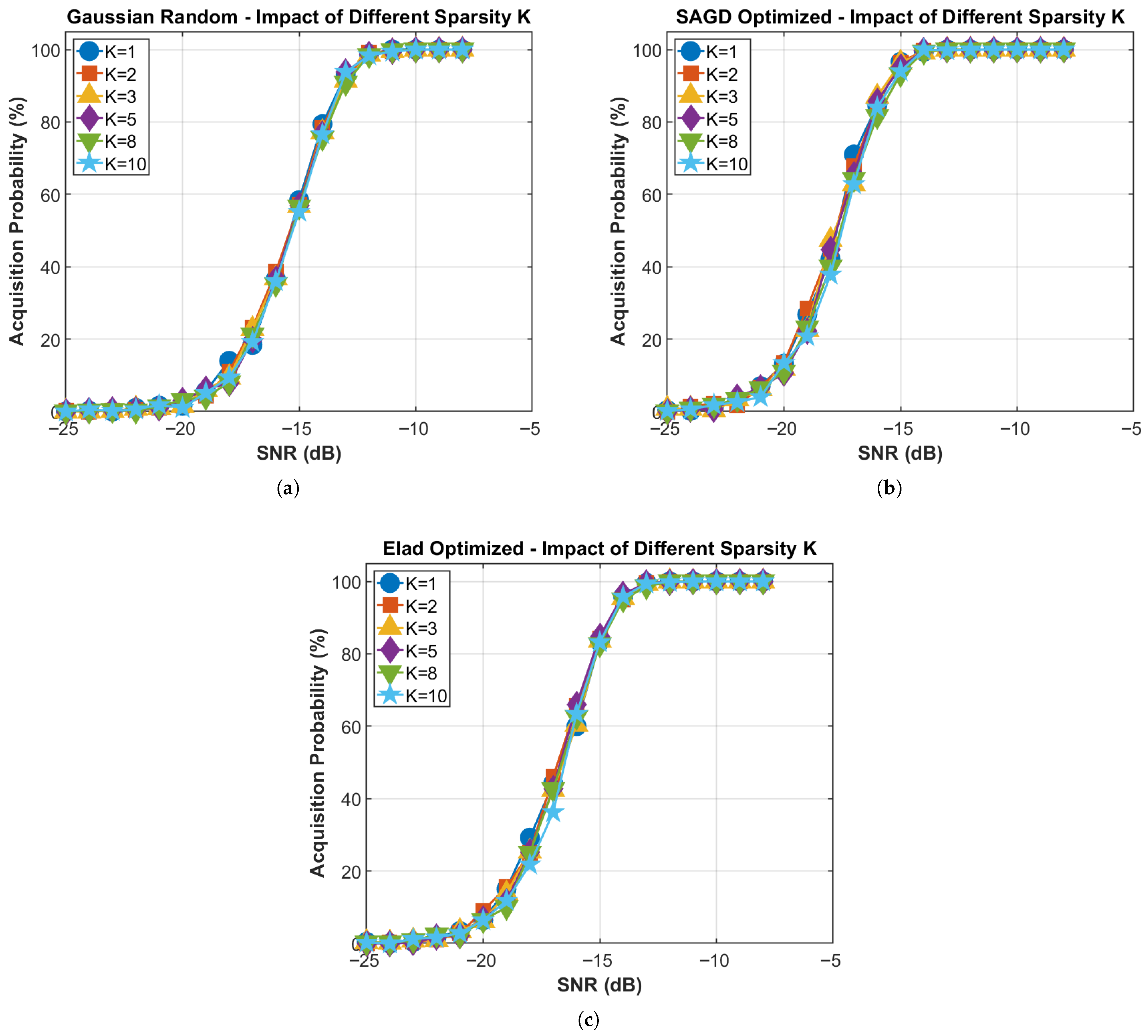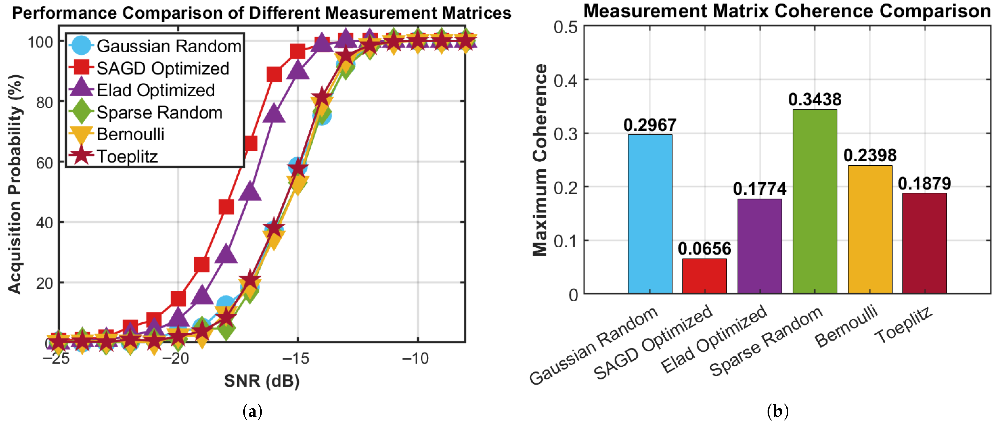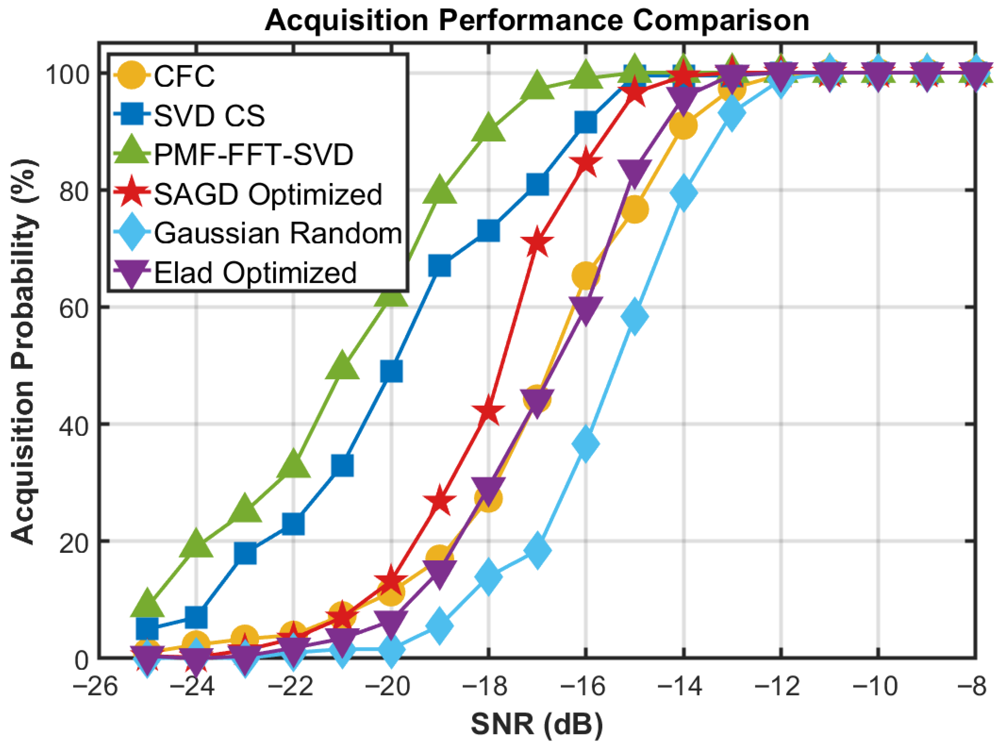 16] improved compressed sensing (CS)-based acquisition by constructing a singular value decomposition (SVD)-based Gaussian measurement matrix with enhanced mutual incoherence, achieving higher acquisition probability at low SNR (signal-to-noise ratio). Building on this, Zhang et al. [