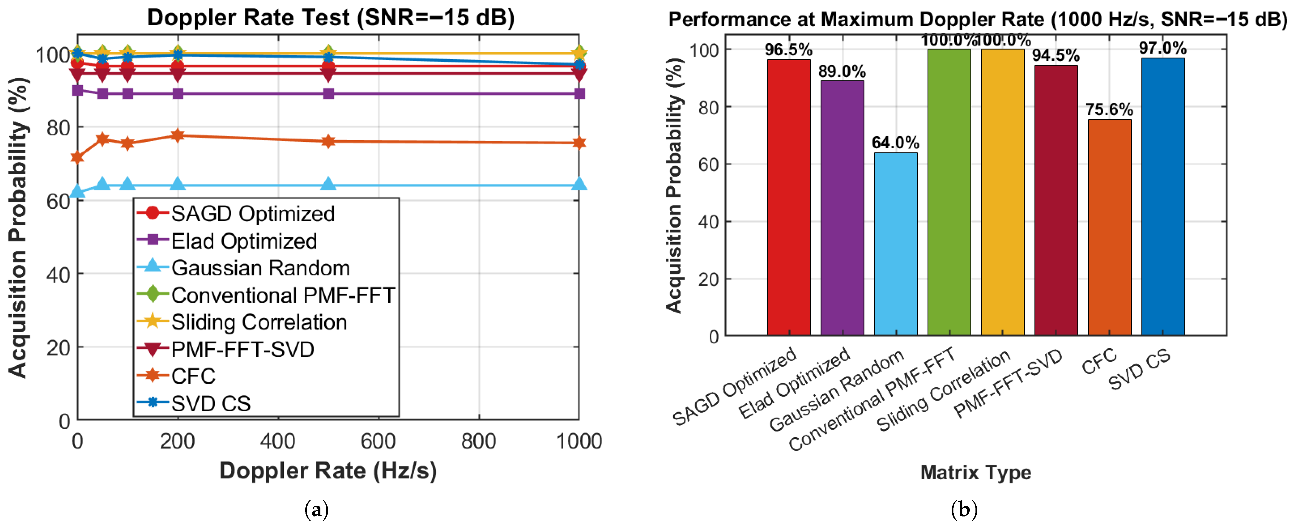 Figure 8a shows acquisition probability versus Doppler rate for multiple schemes. The proposed SAGD–FCS remains highly stable across the entire rate range, decreasing only from