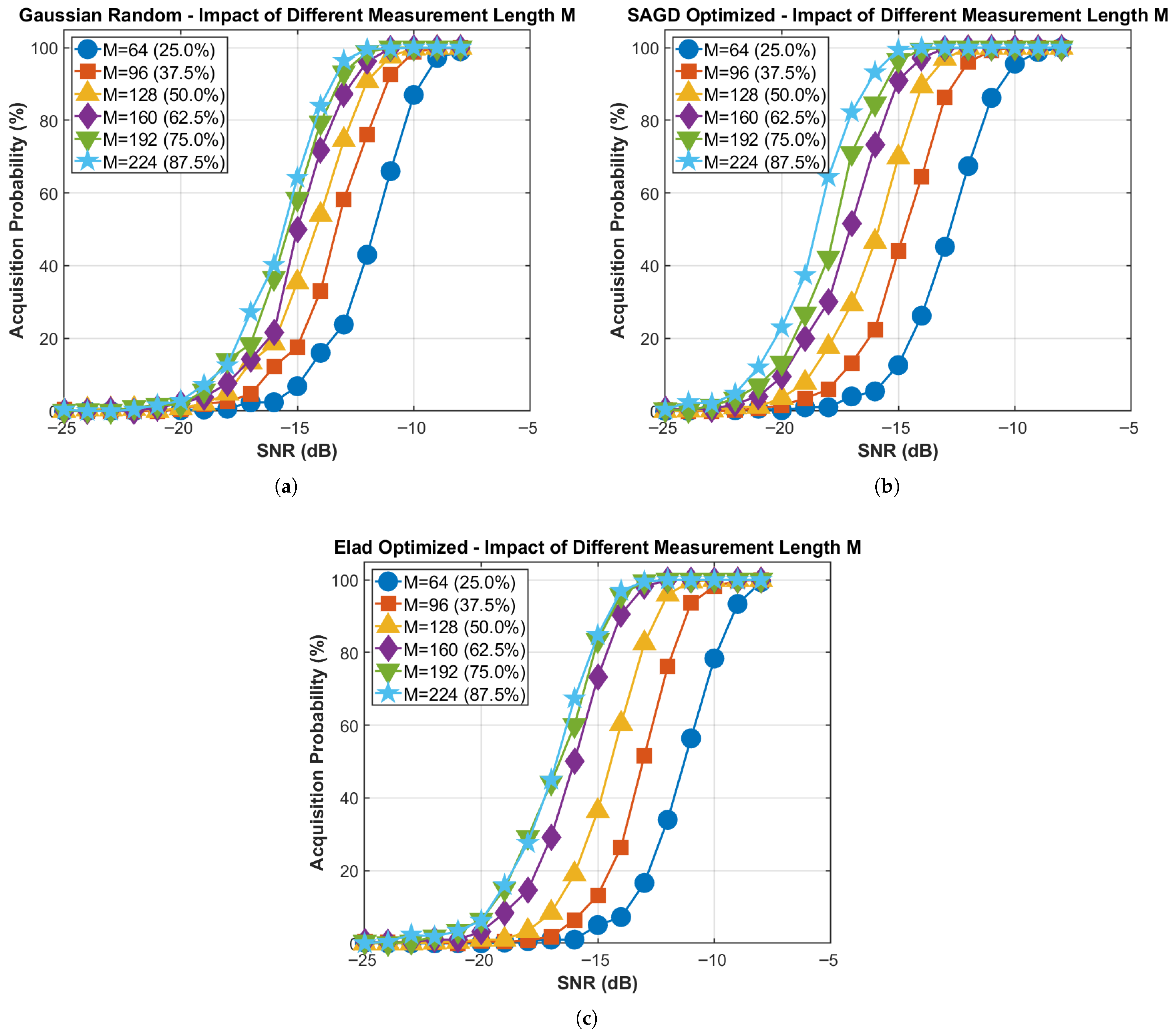 Finally, we comprehensively evaluate the impact of measurement length M (compression ratio) and assumed sparsity level on acquisition robustness under various Doppler uncertainties, thereby providing practical guidelines for parameter selection in real-world high-dynamic GNSS receivers.