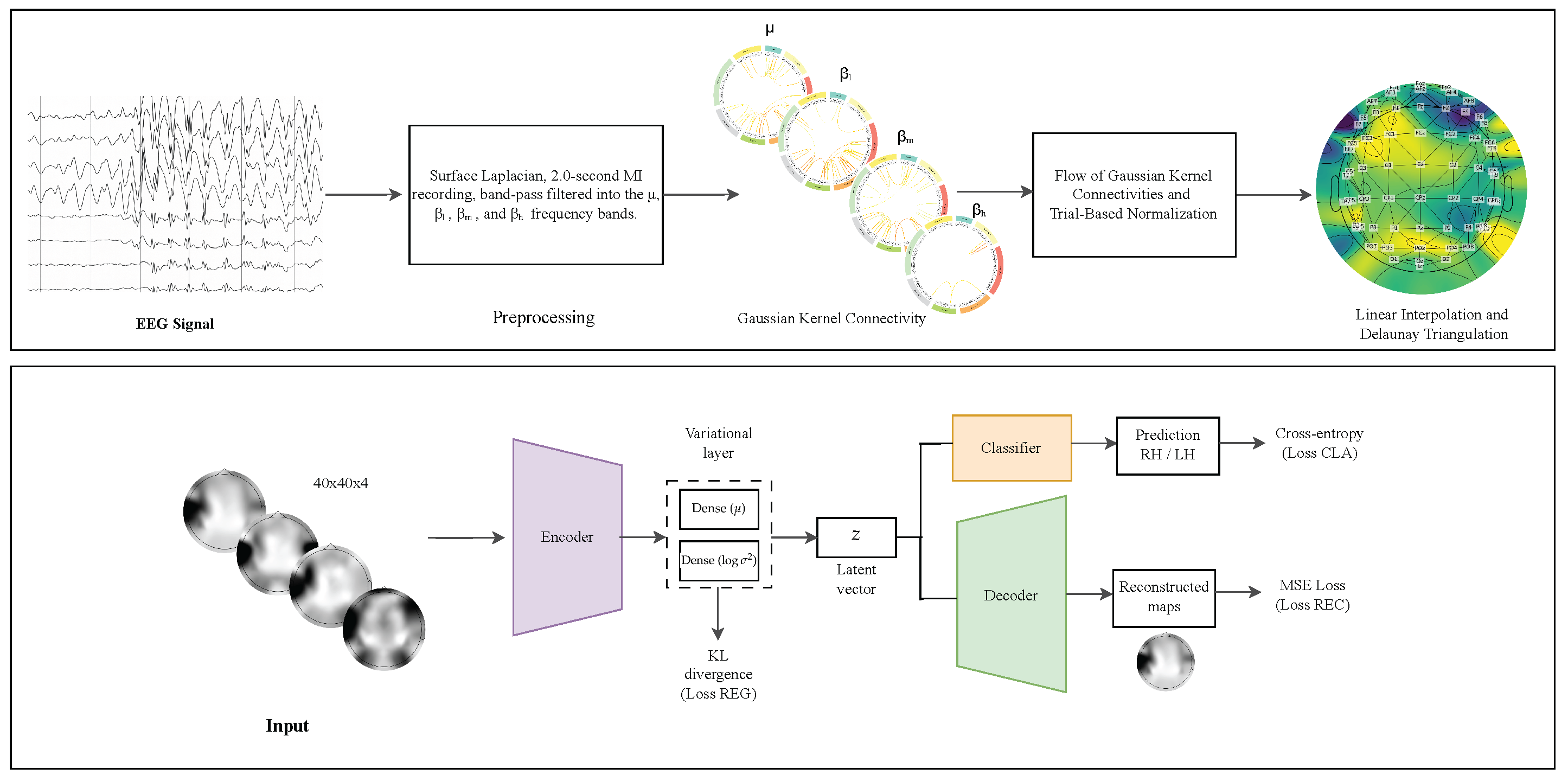 The proposed model is a variational autoencoder (VAE) designed to process topographic maps derived from functional connectivity representations. Its architecture relies on a single input stream that learns to extract and encode the most relevant spatial features from the maps, which are then projected into a shared latent space where a multivariate Gaussian distribution is modeled. From this latent space, the model simultaneously performs reconstruction of the topographic maps and classification of motor imagery tasks. These objectives are integrated within a composite loss function that balances reconstruction fidelity, classification accuracy, and latent space regularization. This approach enables the learning of robust and interpretable latent representations capable of capturing discriminative spatial relationships and adapting to the variability and noise inherent in EEG signals.