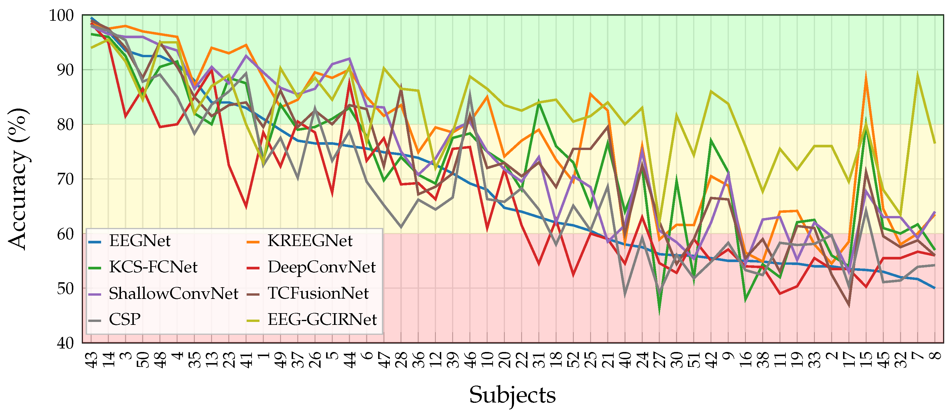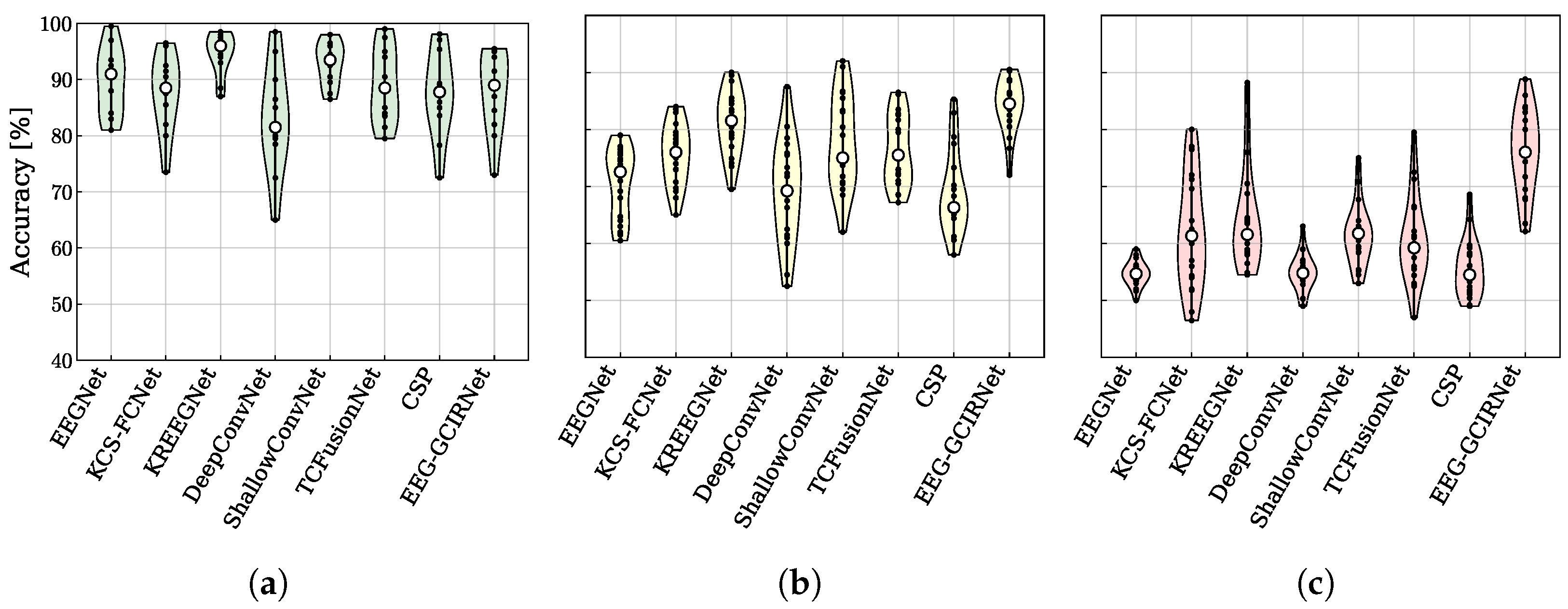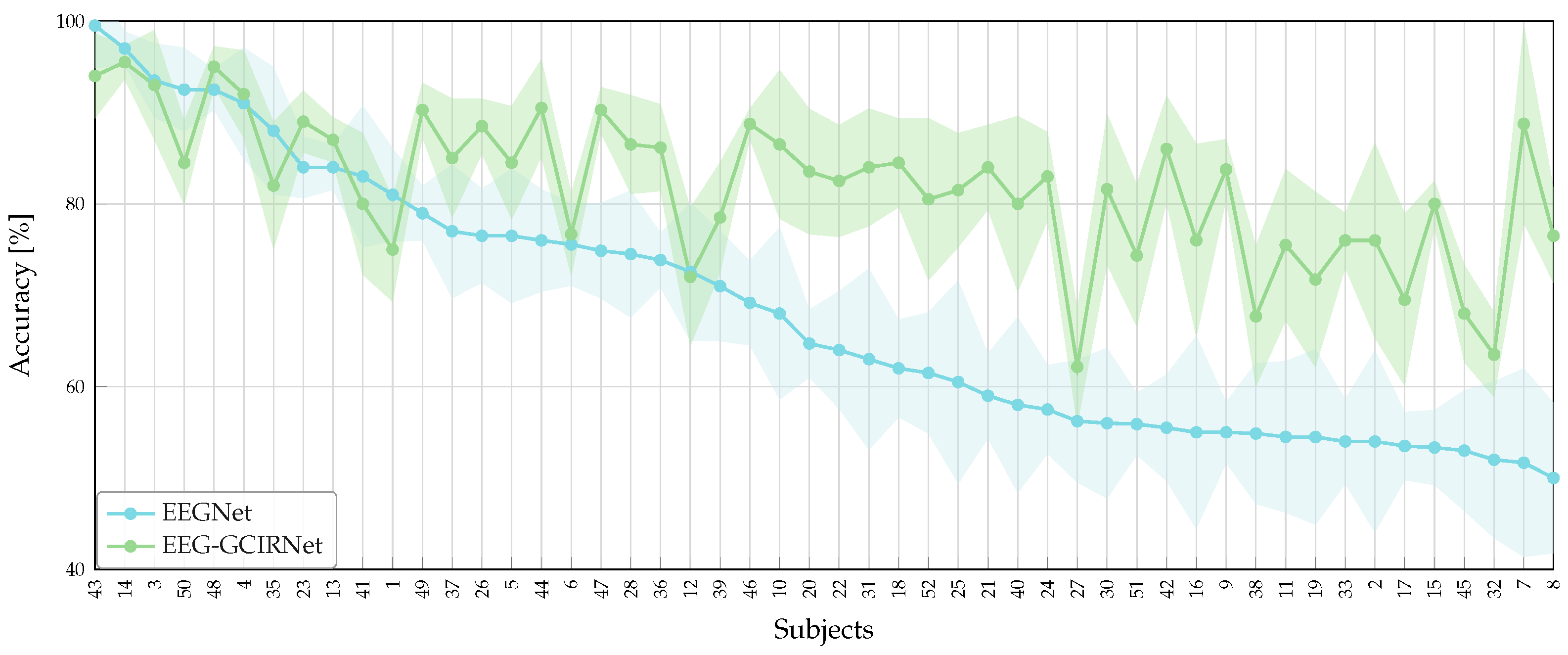 Table 4). This demonstrates the profound robustness of EEG-GCIRNet in handling noisy or low-separability EEG signals, where conventional architectures typically fail. By elevating the performance of these challenging subjects, the framework serves a corrective function, suggesting a promising path toward more inclusive and reliable BCI systems that can adapt to a wider range of users. Furthermore, the scalability of the proposed framework is evidenced by its superior performance in the complex 5-class EEGMMIDB scenario, where it achieved an average accuracy of