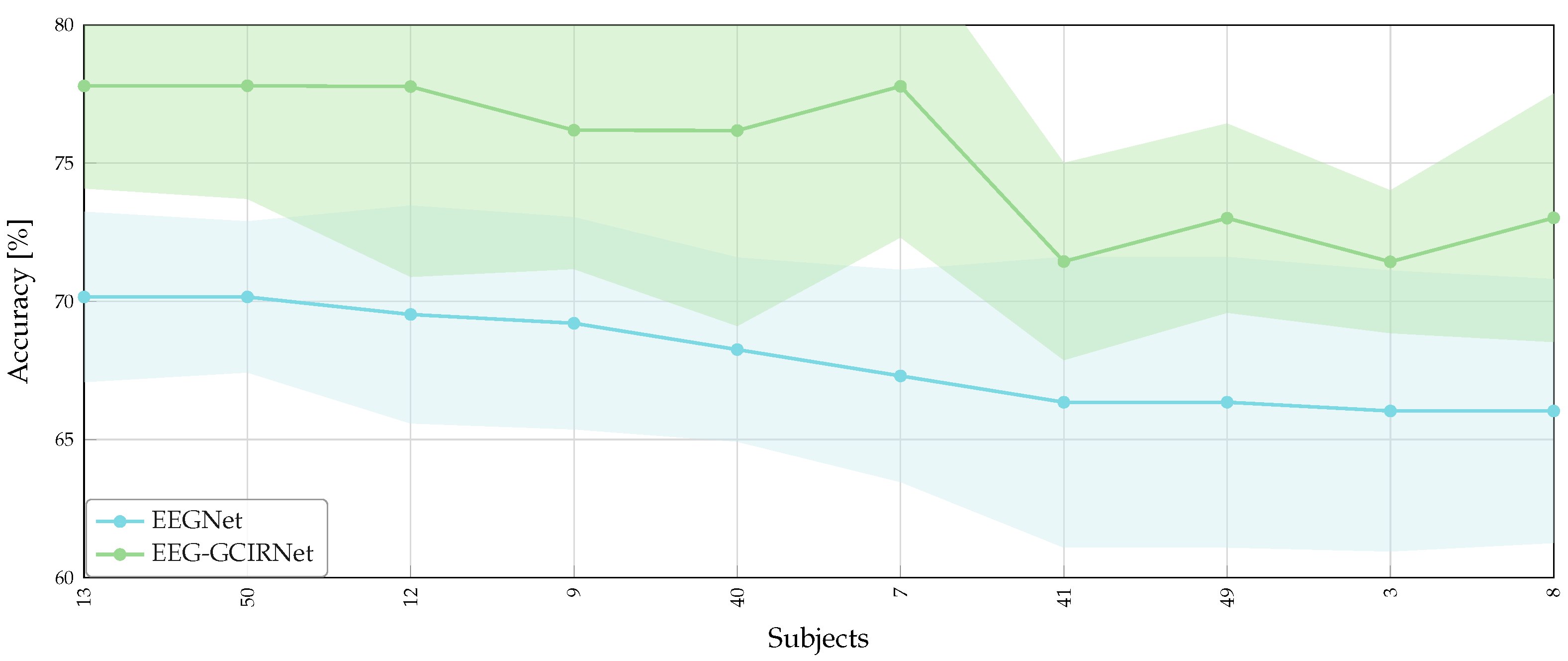 , establishing a statistically clear superiority over advanced architectures like TCFusionNet and DeepConvNet. This indicates that the observed performance gains are not random fluctuations but a consistent outcome of the model’s design. By learning robust latent structures directly from connectivity-based topographic representations, EEG-GCIRNet emerges as a reliable, interpretable, and computationally efficient framework for motor imagery decoding. It effectively balances accuracy, generalization, and representational stability, allowing it to adapt to diverse subject profiles and maintain strong performance across varying signal quality conditions while preserving a physiologically consistent representational organization.