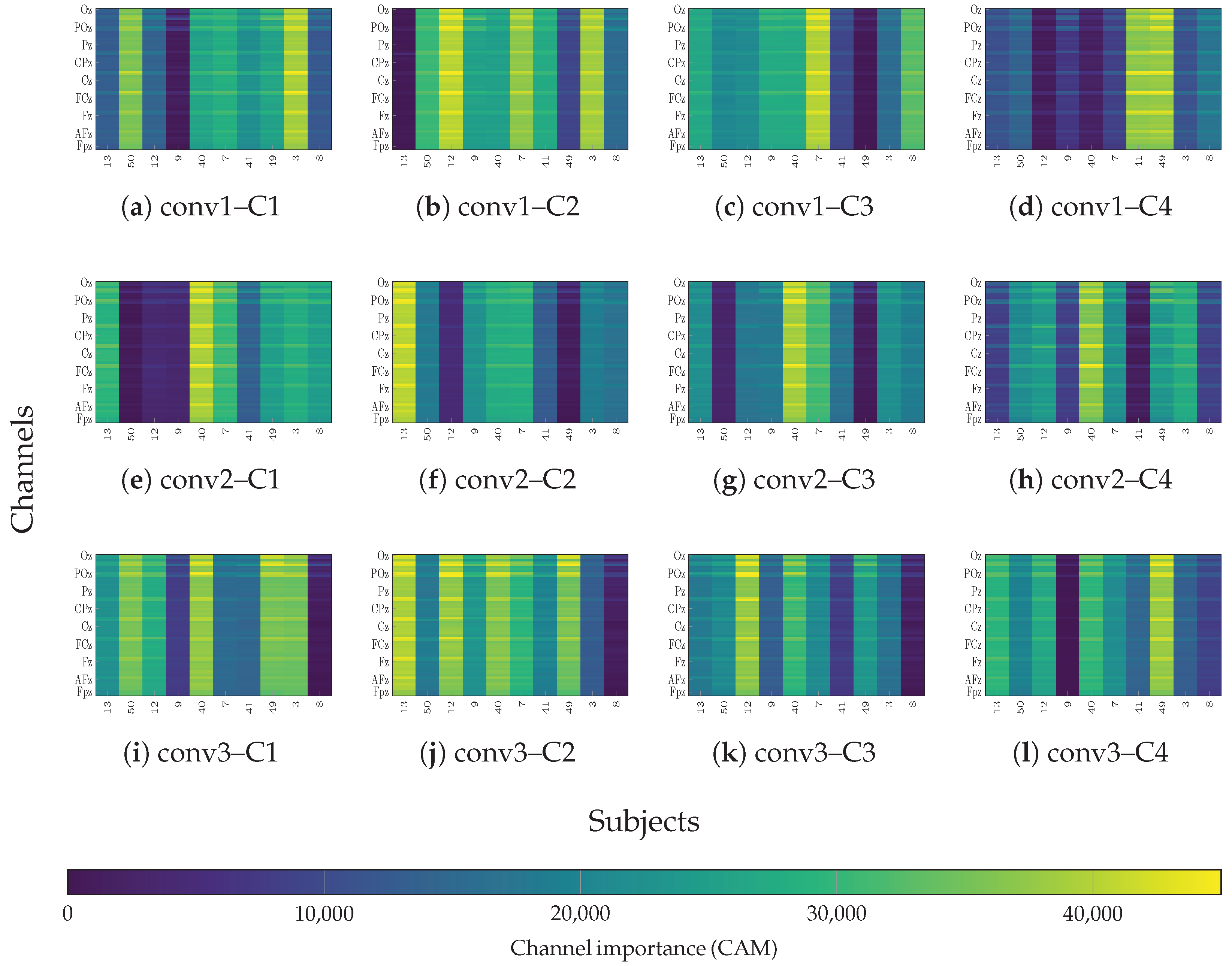 To verify that these learned latent structures correspond to genuine neural mechanisms rather than artifacts, we examined the spatial contribution patterns identified by the network. The layer-wise analysis of the relevance maps reveals consistent spatial structures that align with anatomically meaningful channel groups (see