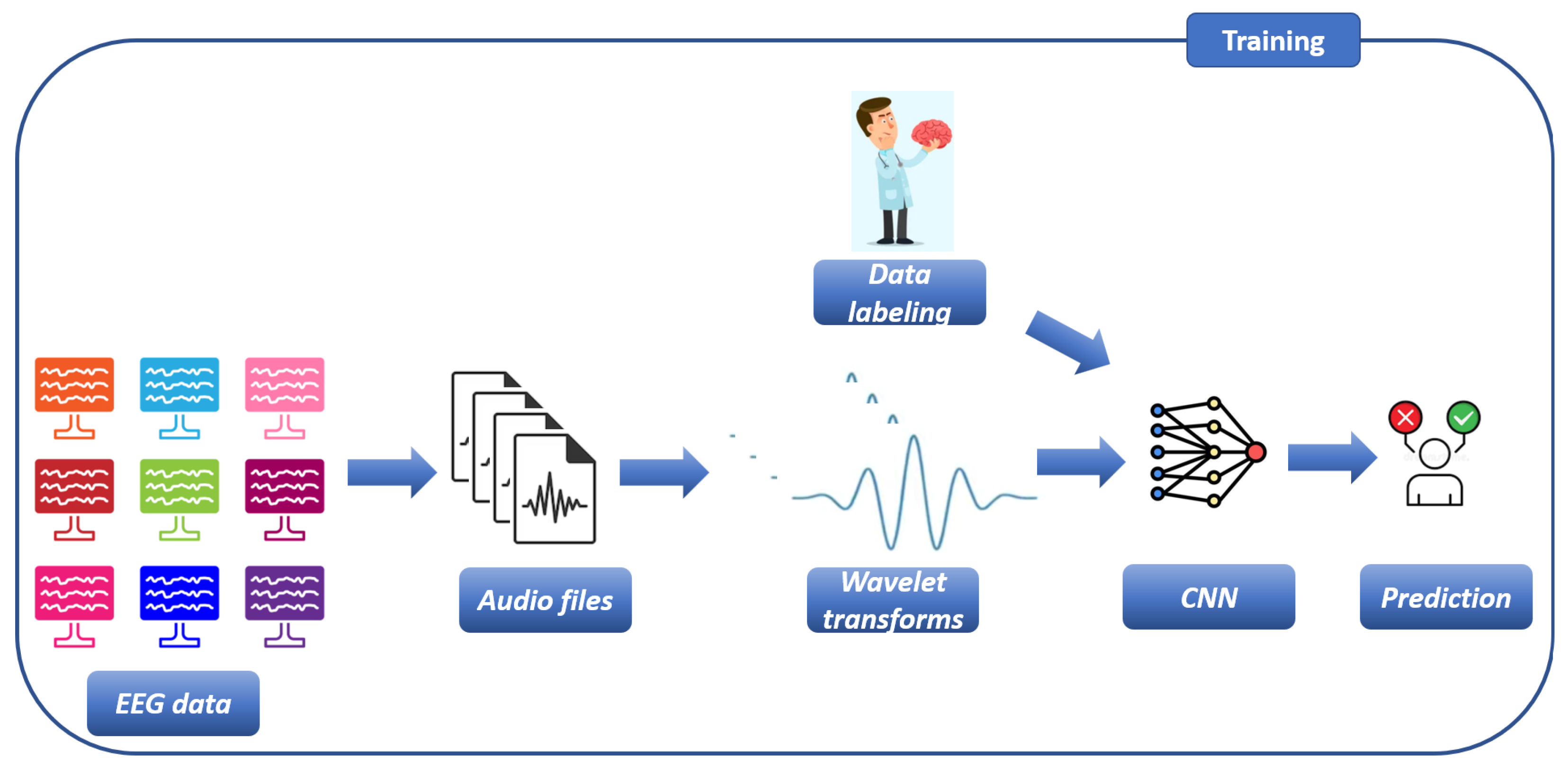 Figure 1, the process begins with the acquisition of EEG data from patients. Once collected, the EEG signals are converted into corresponding audio files.