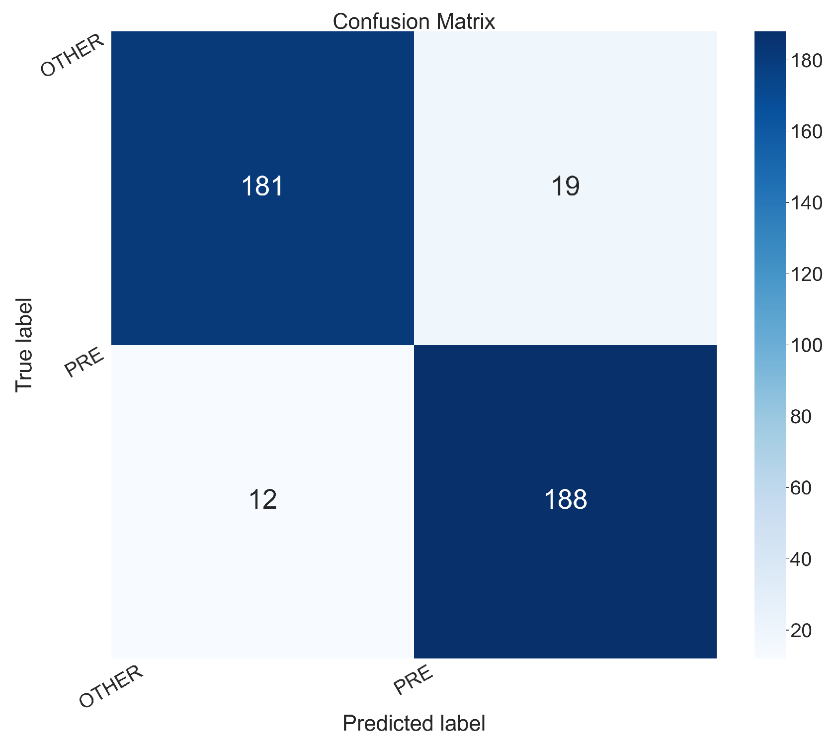True Positives (PRE correctly predicted as PRE): 188