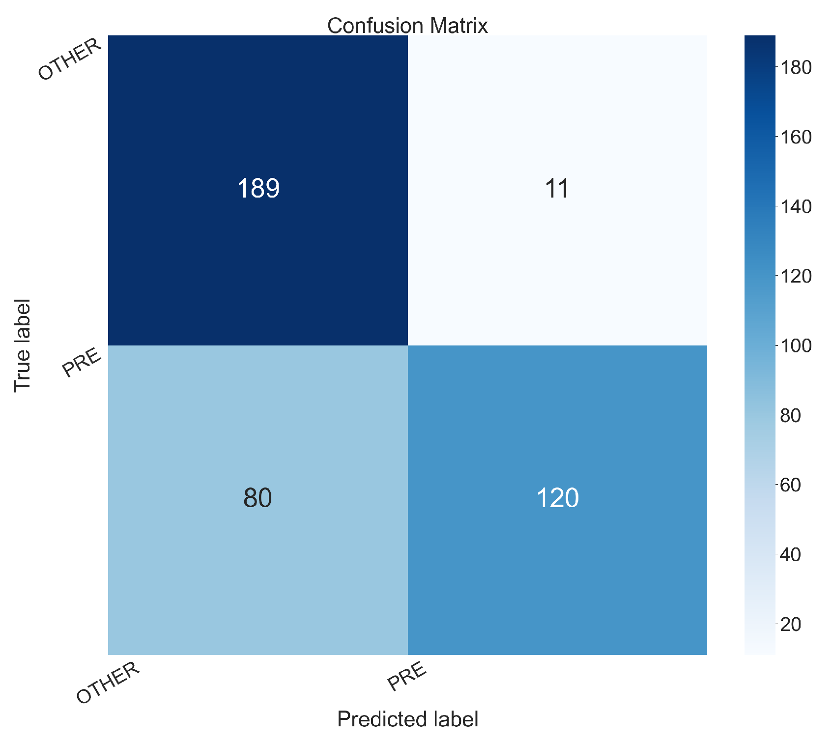 False Negatives (PRE incorrectly predicted as OTHER): 80