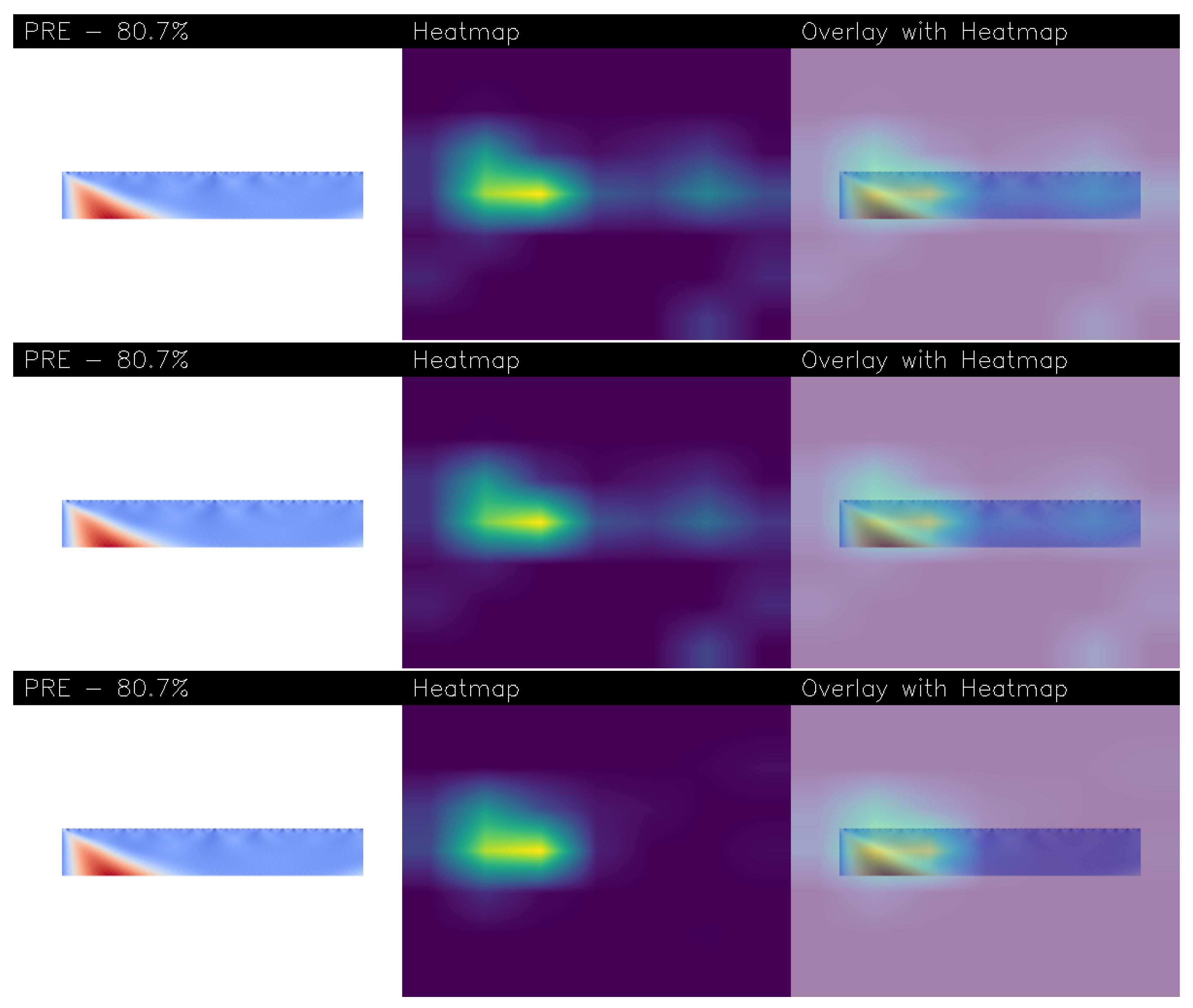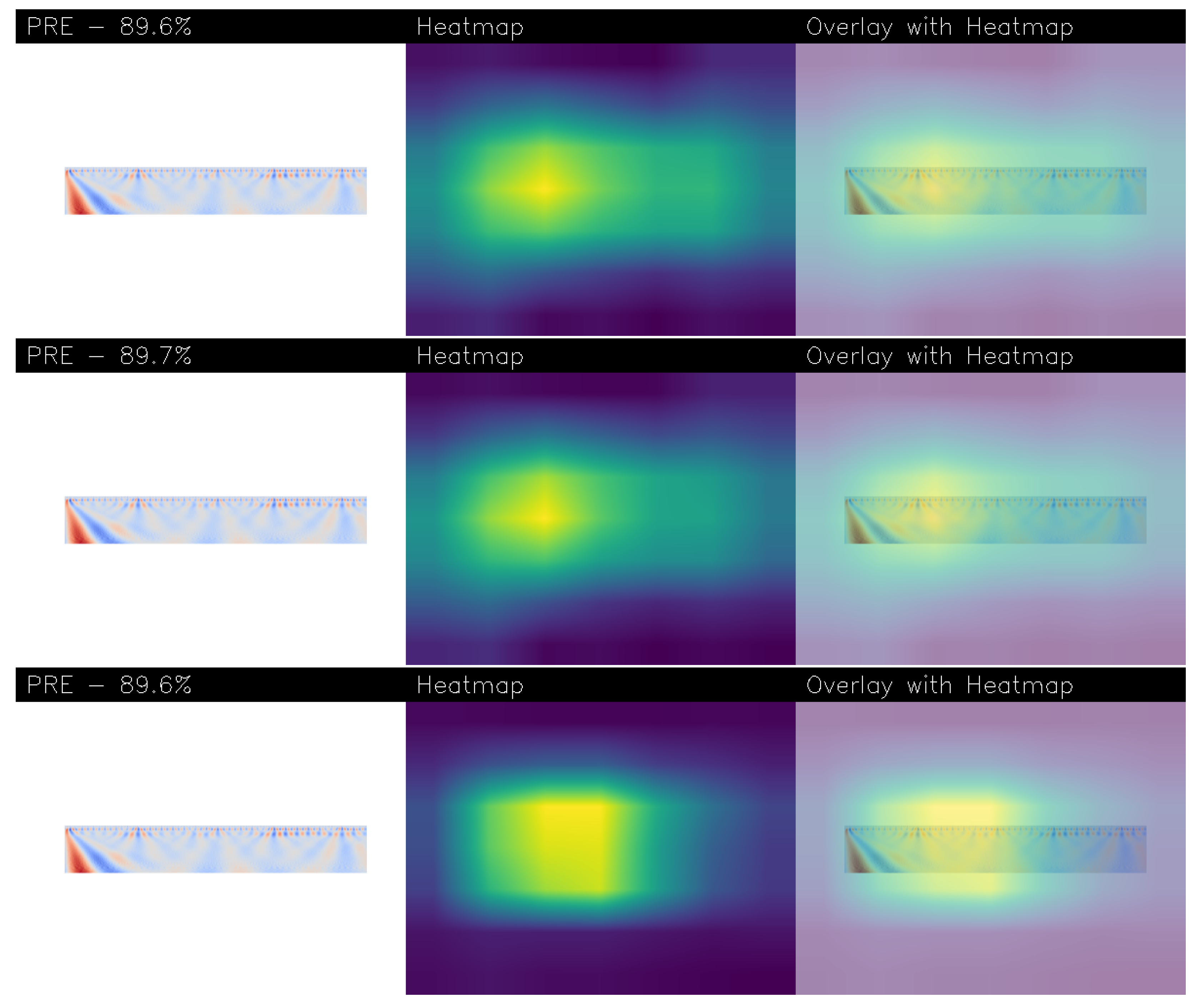 Within each row, a triplet of images is shown: each row is related to a different explainability algortithm, the first one is related to Gradcam++, the second one to the Score-CAM and the last one to the Score-CAM Fast. Thus, in each row, the first image is the original wavelet-transformed EEG plot fed to the network. The central image is a heatmap generated using the VIRIDIS colormap, which translates the model’s focus into a spectrum of colors. Bright yellow areas signify the regions the network deemed most critical (and thus most of interest) for its decision, while green and teal indicate moderate importance, and dark blue or purple tones represent the least influential parts. The final image in the triplet overlays this heatmap onto the original plot, precisely identifying the area of the input that the network found to be symptomatic of the pre-epileptic condition. Additionally, each analysis includes the model’s confidence percentage for the “PRE” prediction.