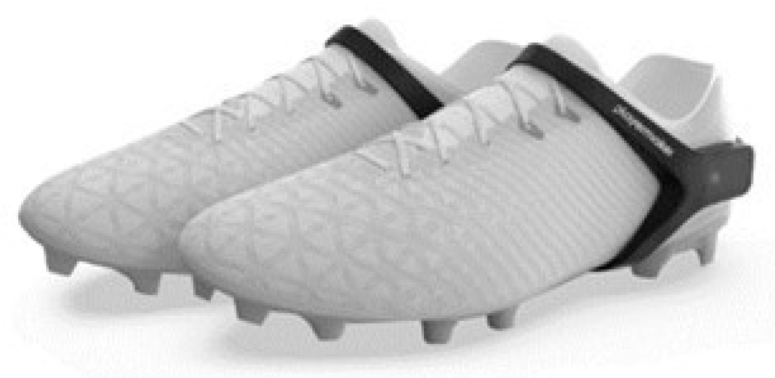 Figure 2. PlayerMaker™ system fitted to the later-posterior aspect of the foot [24].