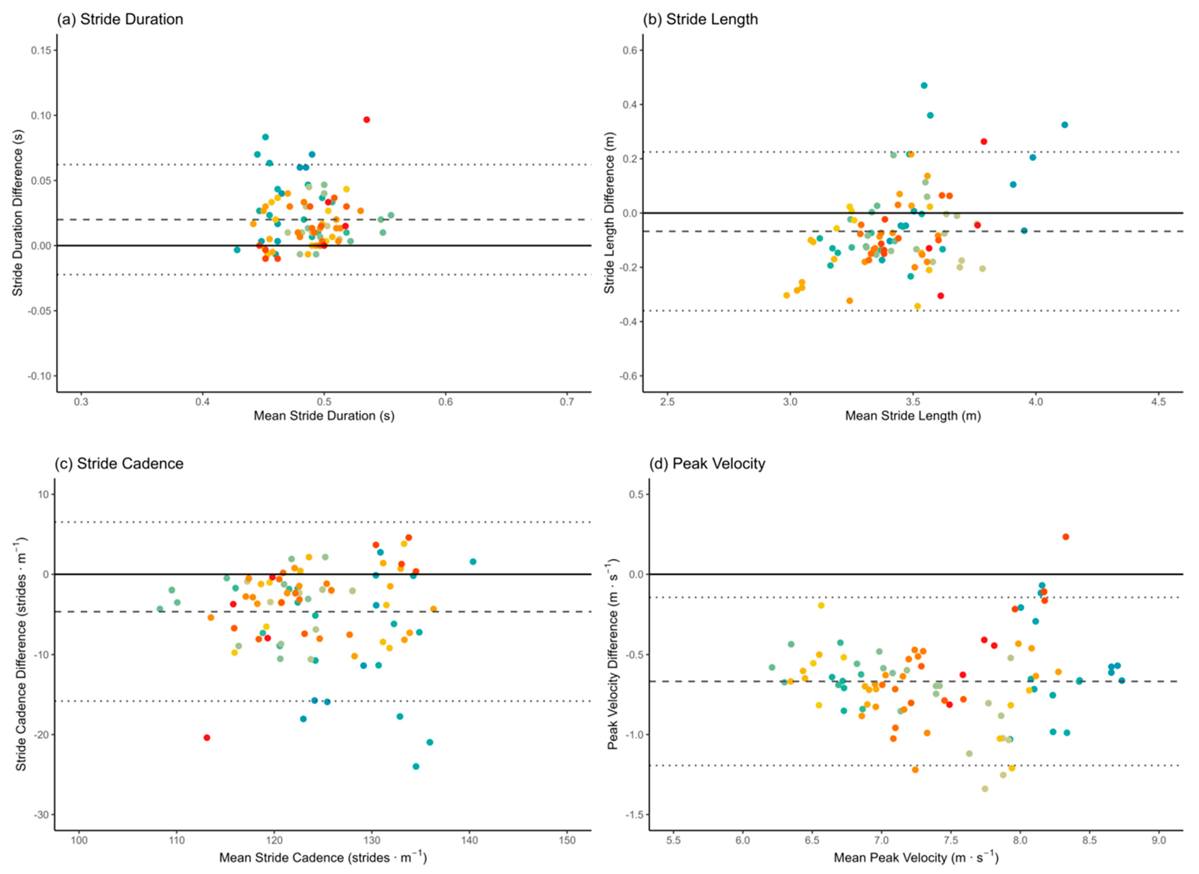 Figure 3. Bland–Altman plots comparing PlayerMaker™ and VICON 3D motion capture system for spatiotemporal gait-related metrics reporting the mean difference and 95% LoA for all trials (n = 92). Note: (a) stride duration, (b) stride length, (c) step cadence, (d) peak velocity. Dashed line = mean difference, dotted lines = 95% LoA (±1.96 × standard deviation of differences). Each colour represents a participant.