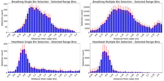 Figure 3 shows the distribution of the selected range bins for breathing (top) and heartbeat (bottom) using single (left) and multiple (right) bin selection. These plots highlight the different spatial segments in which the algorithms identify the breathing and heartbeat signals.