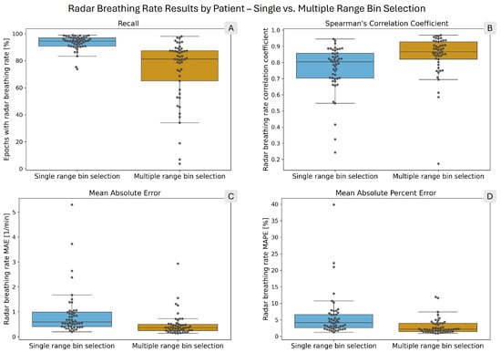 Box plots showing the distribution of per-patient radar breathing rate performance metrics. The overlaid points each correspond to one patient. In each panel, the blue box on the left shows the single range bin selection results, while the orange box on the right shows the multiple range bin selection results. (A) shows the radar breathing rate recall. (B) presents Spearman’s correlation coefficient. (C) shows the mean absolute error (MAE), and (D) shows the mean absolute percent error (MAPE) of the computed radar breathing rates.