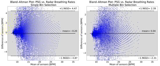 Figure 5 shows Bland–Altman plots of the breathing rate results from single (left panel) and multiple (right panel) bin selection. The mean breathing rate error with single bin selection is −0.20 BPM, while with multiple bin selection it is 0.04 BPM. The 95% confidence interval of the errors is approximately twice as wide with single bin selection ([−4.87, 4.47] vs. [−2.31, 2.39]). For single bin selection, 3.31% of the points are below the lower limit of the confidence interval, and 1.67% are above the upper limit. For multiple bin selection, these values are 1.49% and 1.54%. The distributions of the plots show no appreciable differences. Both are symmetric and do not show any obvious trends.